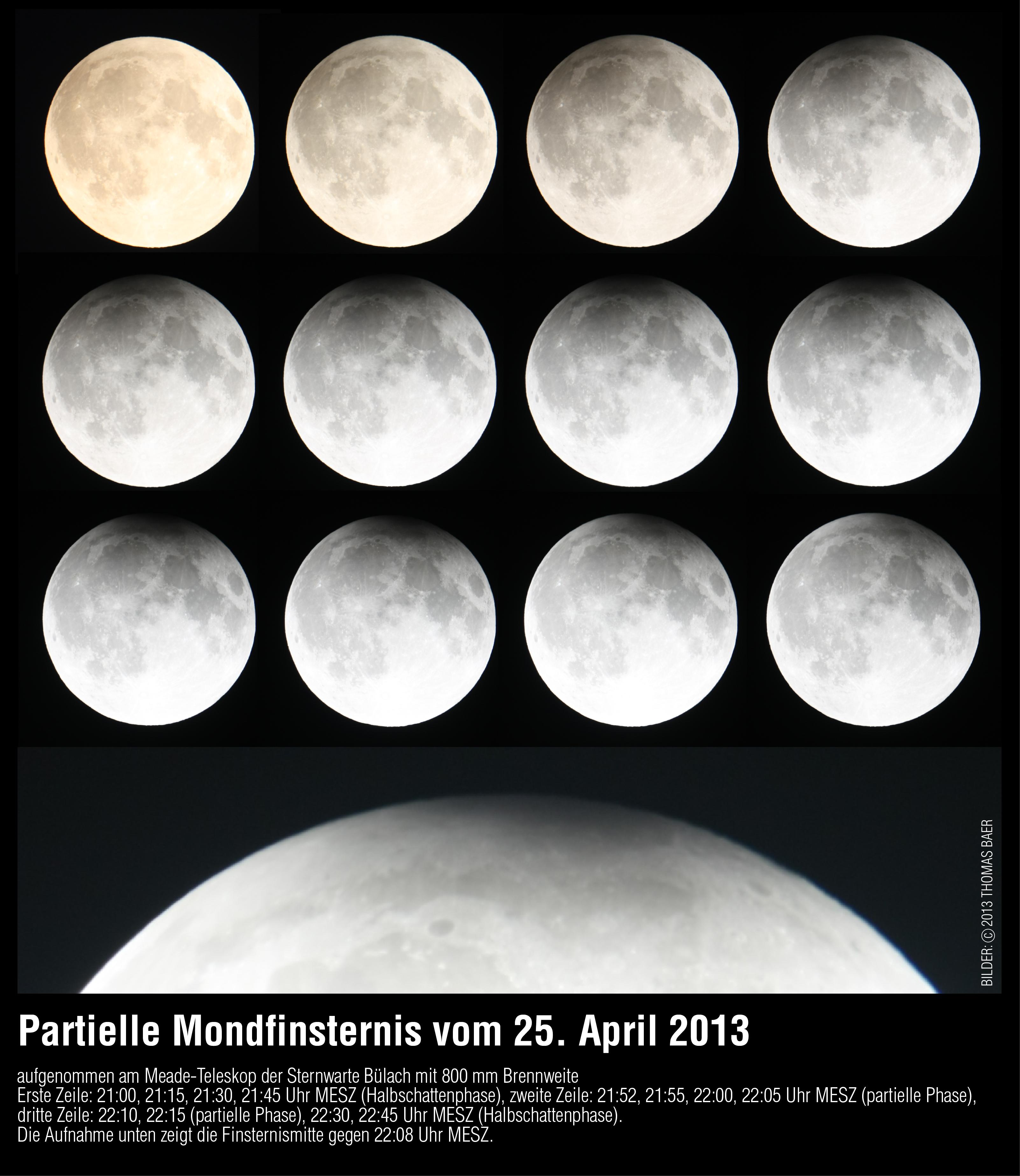 Die kleine partielle Mondfinsternis konnte zwischen 21:52 Uhr und 22:23 Uhr MESZ einwandfrei von bloßem Auge wahrgenommen werden. Spektakulärer war aber der Anblick zweifelsohne durch ein Fernglas oder ein Teleskop. Die minimale Beschattung durch den Erdkernschatten betrug im Maximum knappe zwei Prozent. In der Ausschnittsvergrösserung sind die leichte Wölbung und die Unschärfe des Schattenrandes, bedingt durch die Erdatmosphäre, deutlich zu sehen.