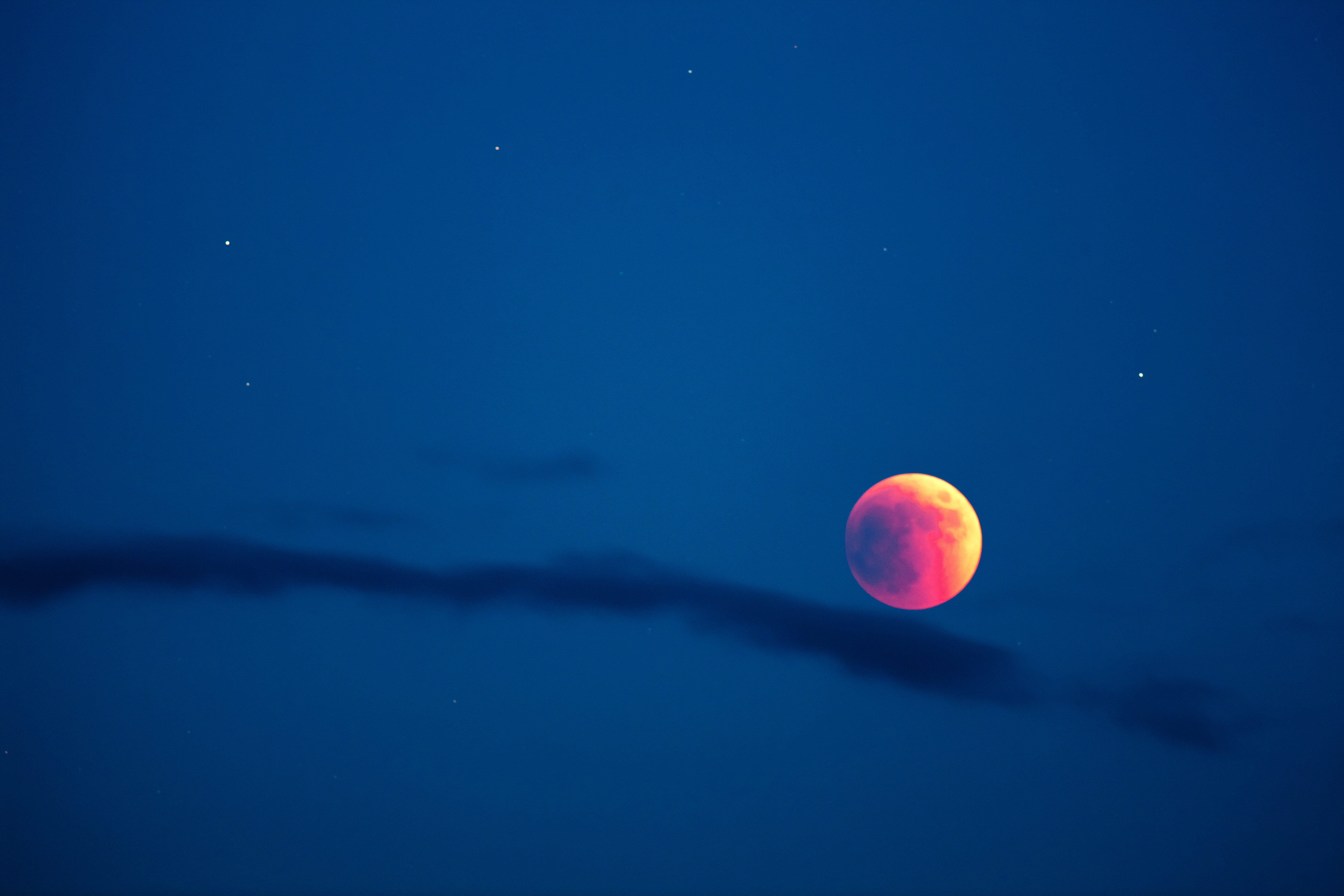In Graz ging der Mond knapp vor 21 Uhr MESZ in der Abenddämmerung auf. Da die Verfinsterung noch nicht in die totale Phase übergegangen war, konnte man den Mond am Horizont gut erkennen. Wenig später nahm der Kontrast zum Hintergrund durch die Verdunklung des Mondes immer mehr ab, bis er beim Eintreten der Dunkelheit wieder zunahm – ein spannendes Schauspiel. Nun konnte man gut erkennen, wie sich der Kernschatten der Erde über die Mondfläche bewegt. Diese Aufnahme zeigt den Mond 17 Mnuten vor der maximalen Verdunklung, der Kernschatten ist noch leicht links des Zentrums der Mondscheibe.