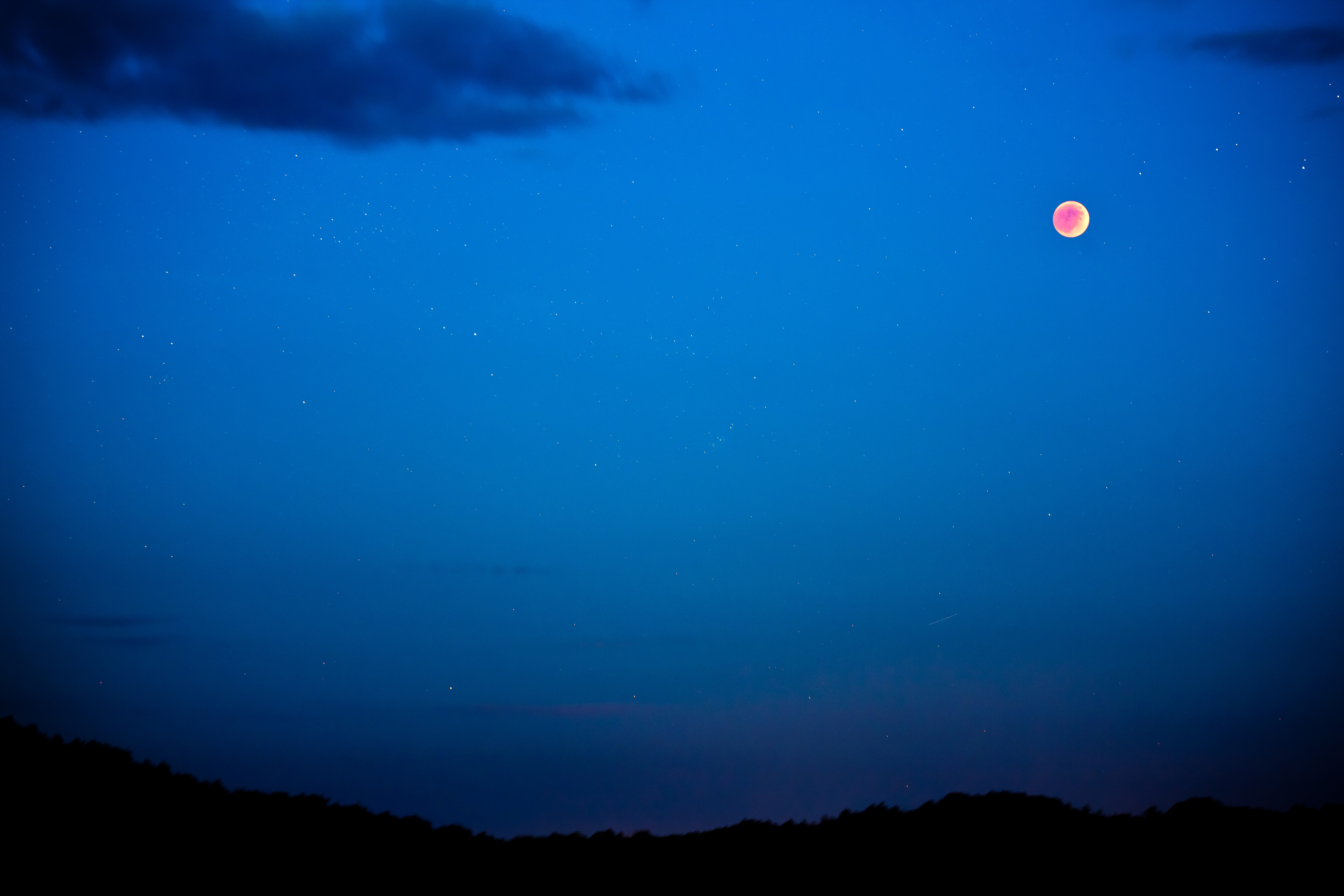 In Graz ging der Mond knapp vor 21 Uhr MESZ in der Abenddämmerung auf. Da die Verfinsterung noch nicht in die totale Phase übergegangen war, konnte man den Mond am Horizont gut erkennen. Wenig später nahm der Kontrast zum Hintergrund durch die Verdunklung des Mondes immer mehr ab, bis er beim Eintreten der Dunkelheit wieder zunahm – ein spannendes Schauspiel. Diese Aufnhame zeigt den Mond 12 Minuten vor dem Eintreten der Totalität, der Mond ist also rechts oben noch nicht ganz verdunkelt. In der Bildmitte ist ansatzweise der Lagunennebel zu sehen.