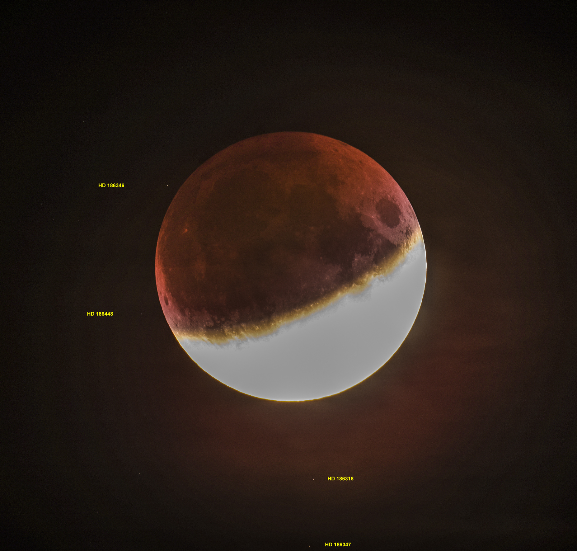 Durch eine besondere Bearbeitung in Lightroom tritt der rote Erdschein deutlich hervor. Auch werden die hellsten Umgebungssterne (Sagittarius) sichtbar.