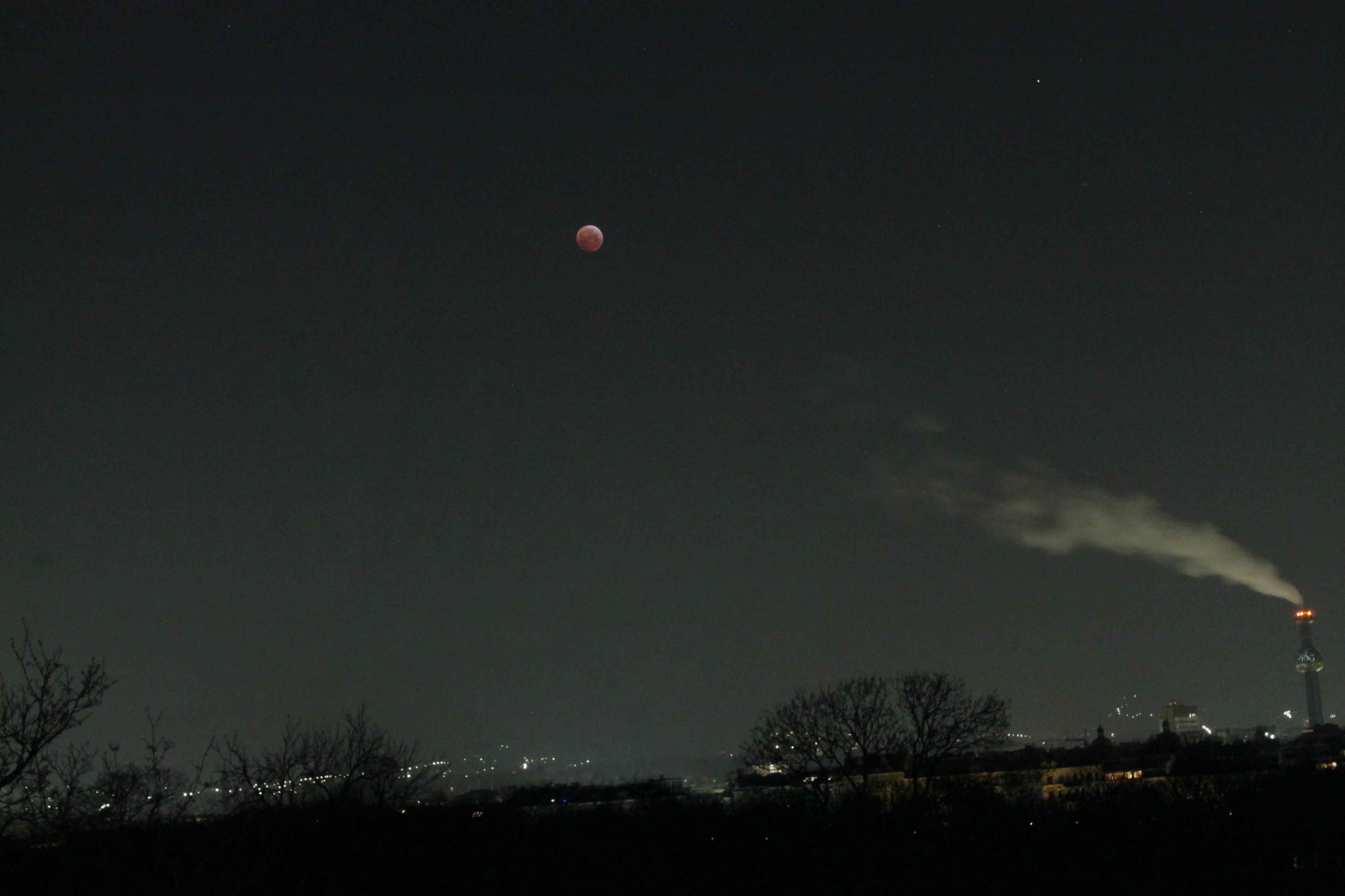 Foto der Mondfinsternis vom 21. Jänner 2019 über Wien, rechts das Hundertwasser-Fernheizwerk in Wien.