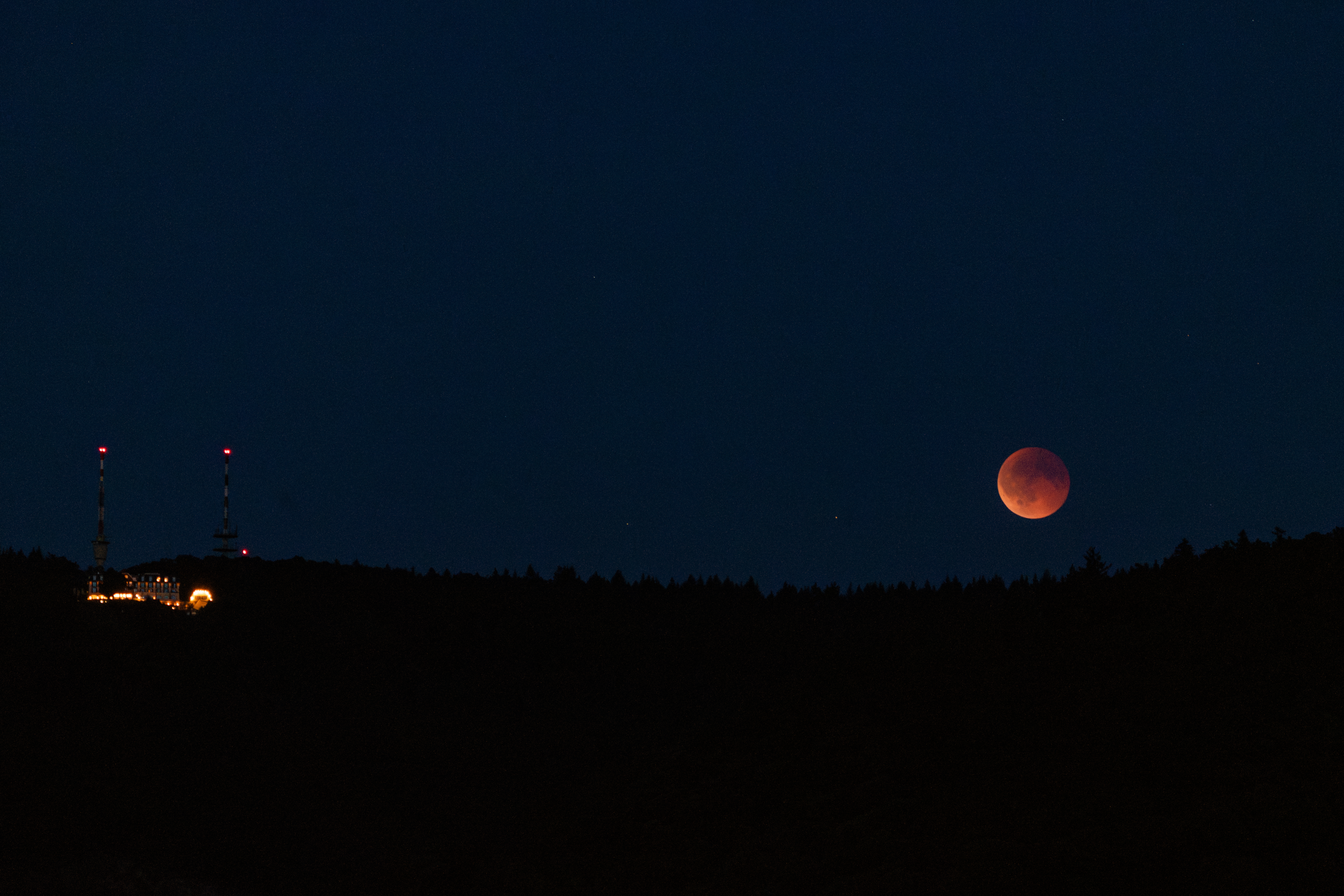 Gemeinsam haben verschiedene Menschen, die von dem Phänomen gehört hatten, auf einer Neckarbrücke gewartet, bis der verfinsterte Mond hinter den Gipfeln des Königstuhls aufgetaucht ist. Als es dann so weit war, ging ein fasziniertes Raunen durch die Menge. Das Fotografieren wurde durch starken Wind erschwert, die Kamera war kaum zu stabilisieren. Ein paar Schnappschüsse sind mir trotzdem gelungen.