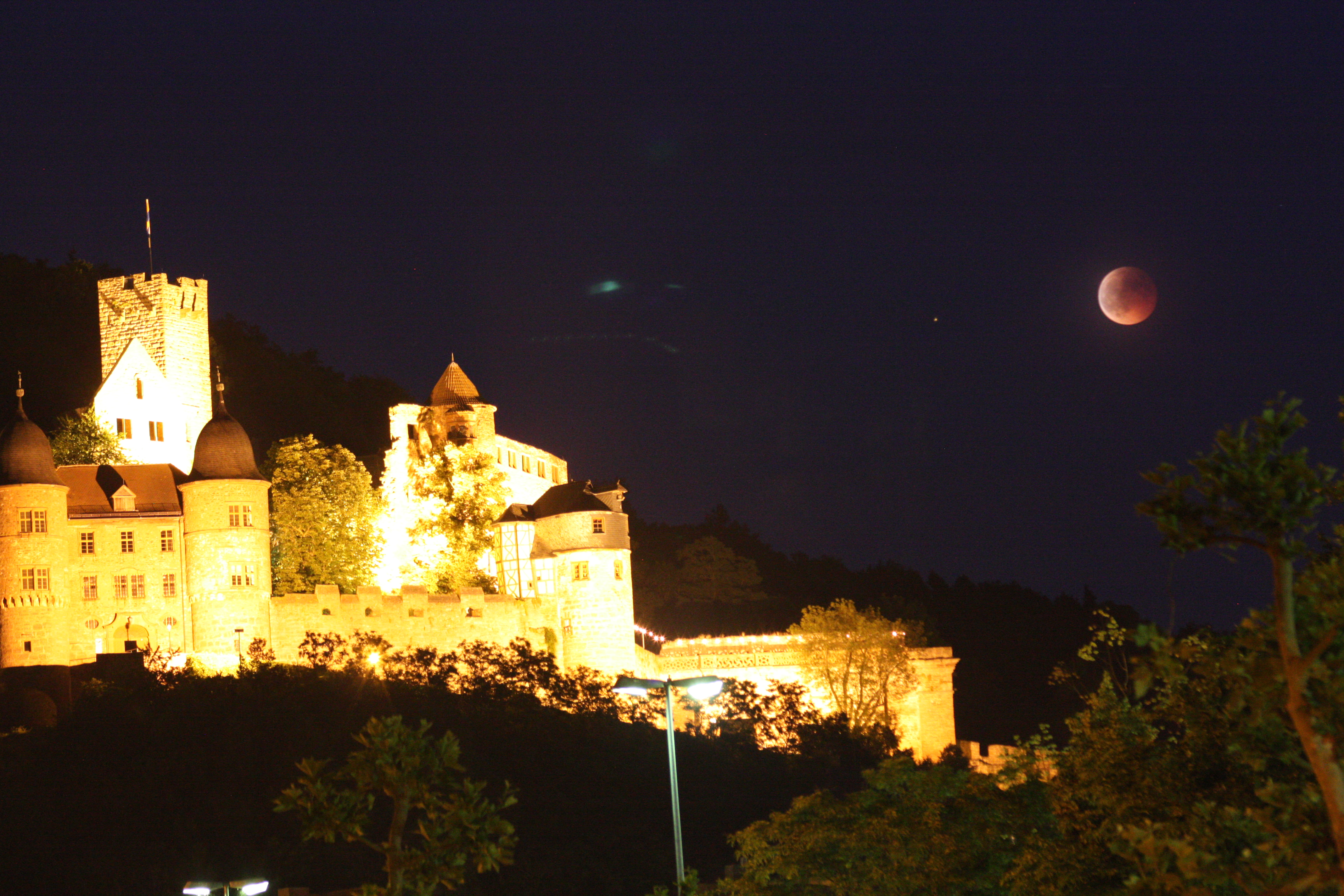 Am 15.6.2011 habe ich die totale Mondfinsternis kurz vor dem Ende der totalen Phase in Wertheim beobachtet. Der Himmel war leicht trüb und der Mond mit bloßem Auge kaum erkennbar. Um die Burg Wertheim mit aufs Bild zu bekommen, habe ich von einem hell erleuchteten Parkplatz direkt am Main fotografiert. Dadurch sind einige Reflektionen der Straßenbeleuchtung mit aufs Bild gekommen.