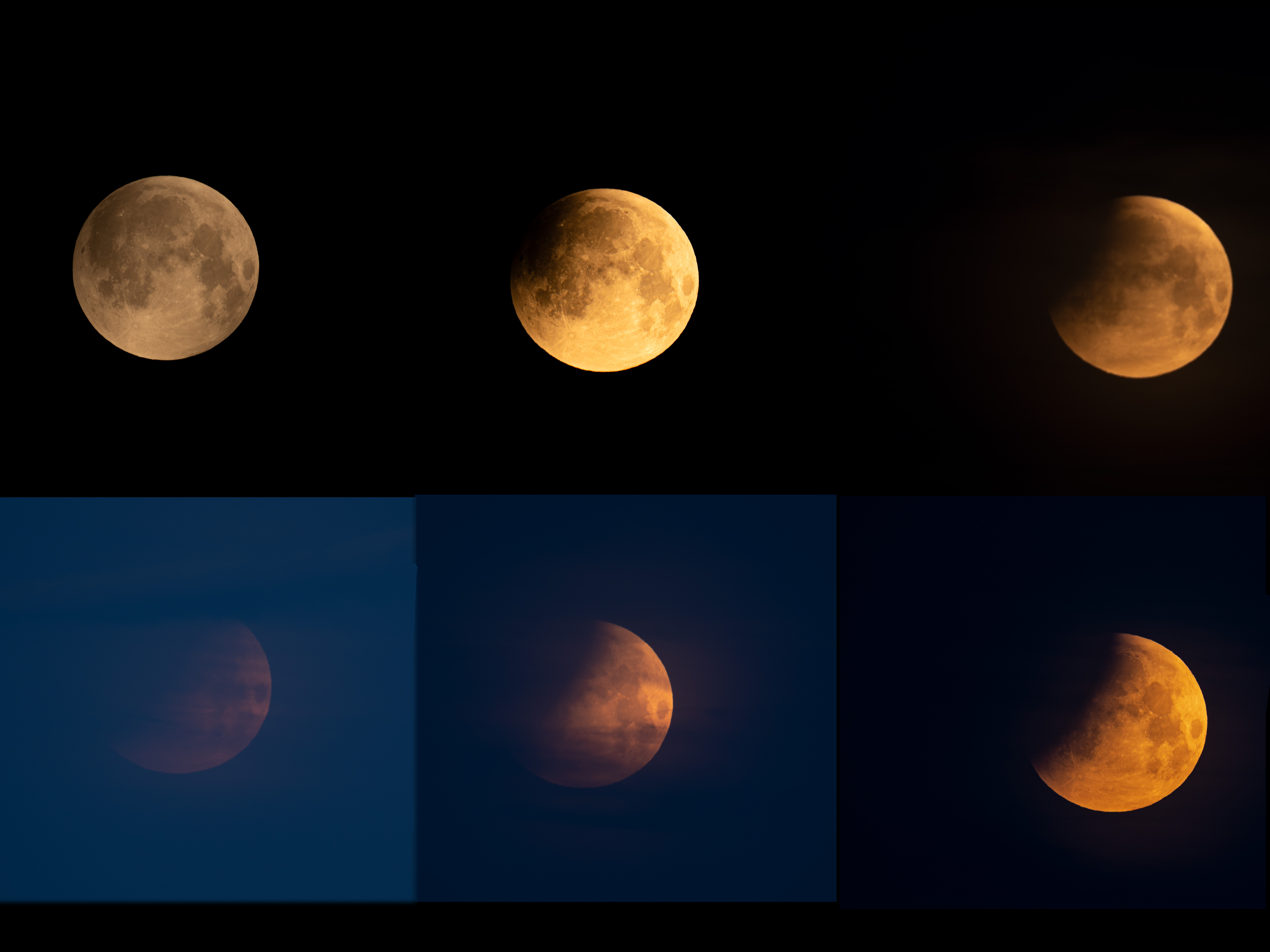 Verlauf der Mondfinsternis von 04:09 - 04:50 Uhr MESZ in Laa an der Thaya, Niederösterreich. Danach war der Mond in der Morgendämmerung und den bodennahen Dunstschichten verschwunden.