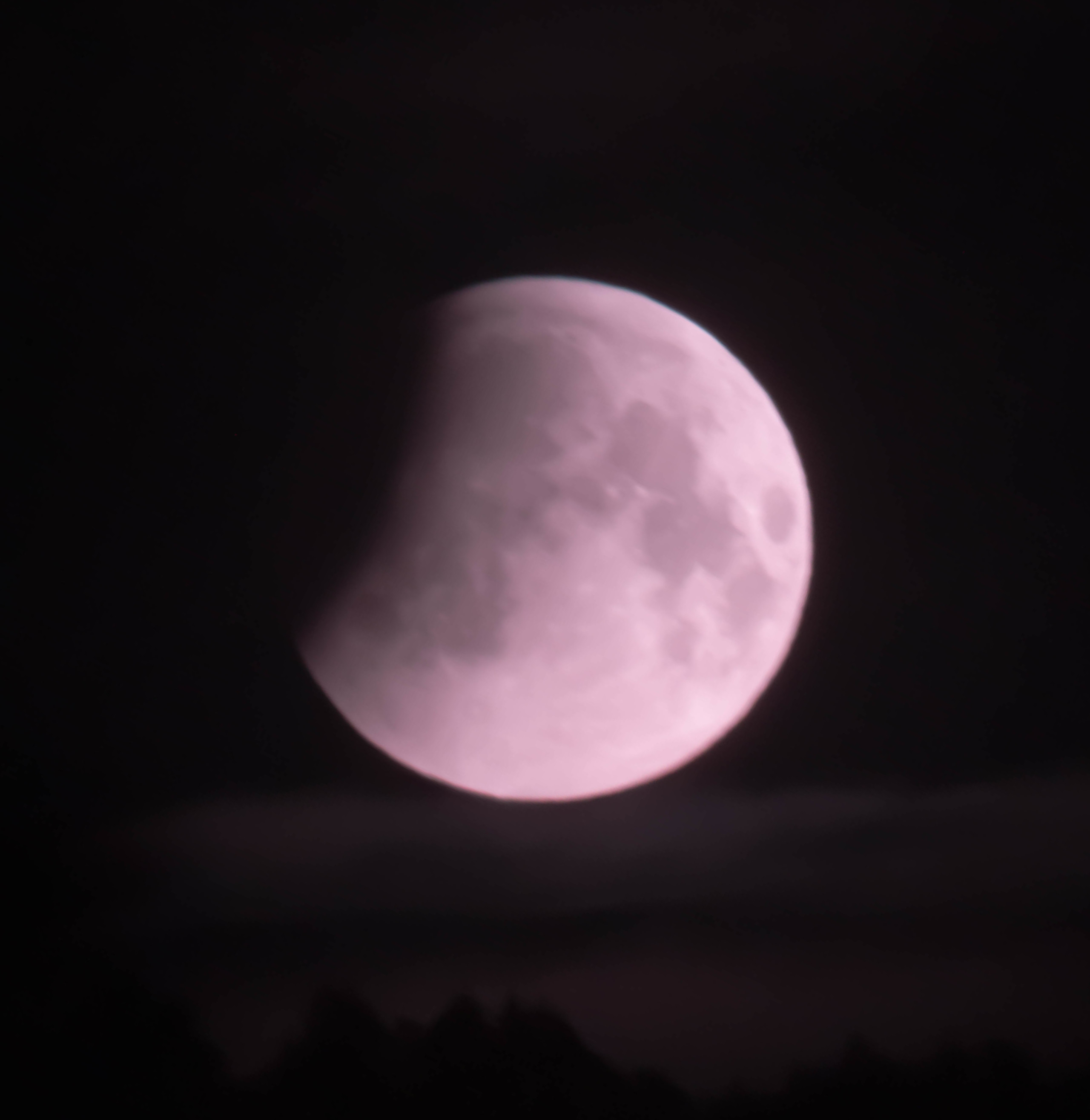 Mondfinsternis am 16. Mai 2022, kurz nach dem Beginn der Verfinsterung und kurz vor dem Untergang des Mondes ...