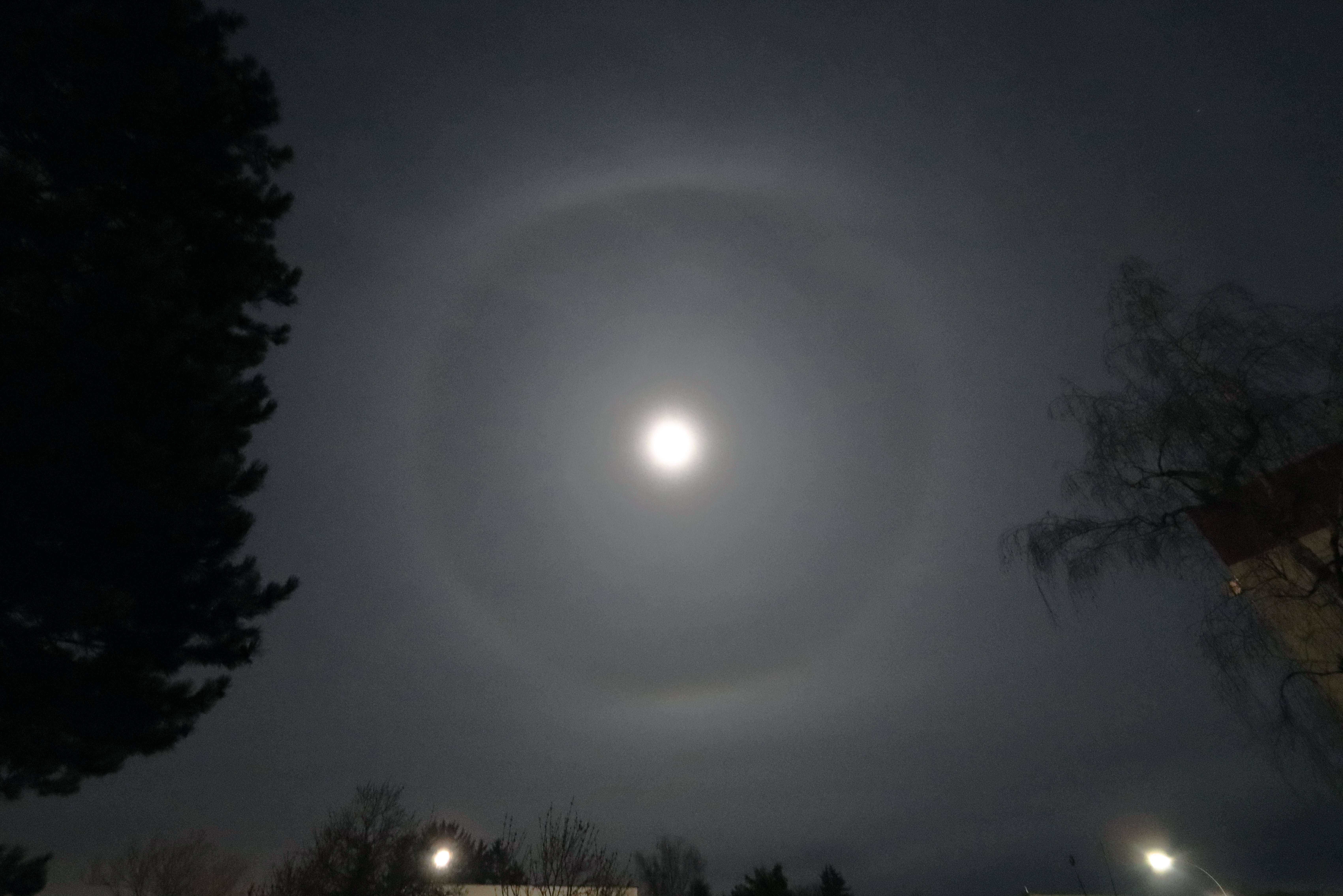 Endlich konnte ich einen Mondhalo im Vorfeld einer Front mit meinem relativ neuen Weitwinkelobjektiv fotografieren, wodurch der gesamte 22-Grad-Ring erfasst wurde, ein 46-Grad-Ring war keiner zu erkennen!