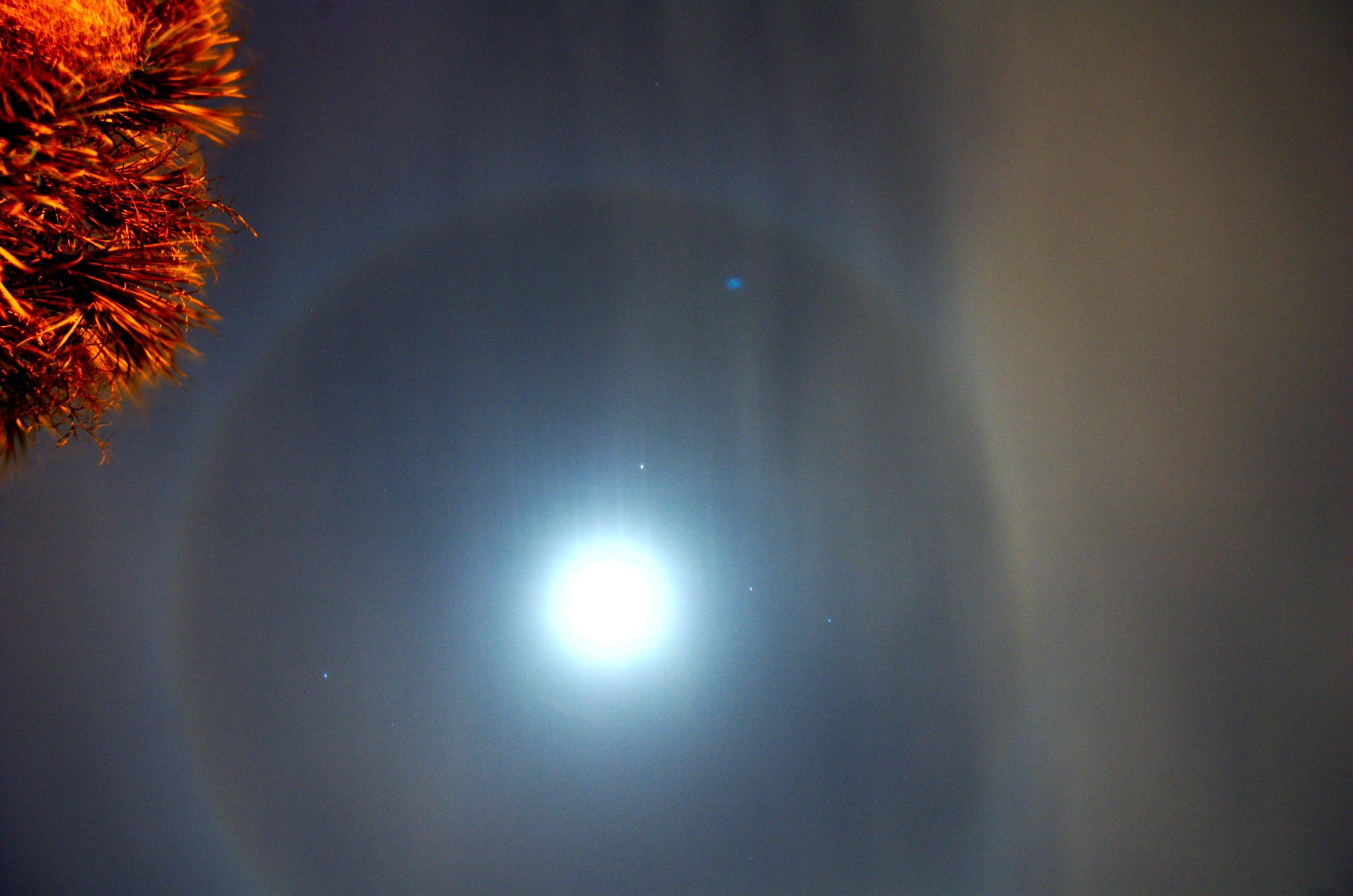 Am 24.3.2010 gegen 21 Uhr (Ortszeit) hatte ich die Gelegenheit, ein spektakuläres Halo des Mondes in den "Kasten" zu bringen. Es hat einige Zeit gedauert, bis ich die Objekte identifizieren konnte, deutlich zu sehen ist aber der Mars, rechts davon Pollux und Castor. Links unterhalb des Mondes sieht man Procyon im Sternbild Kleiner Hund.