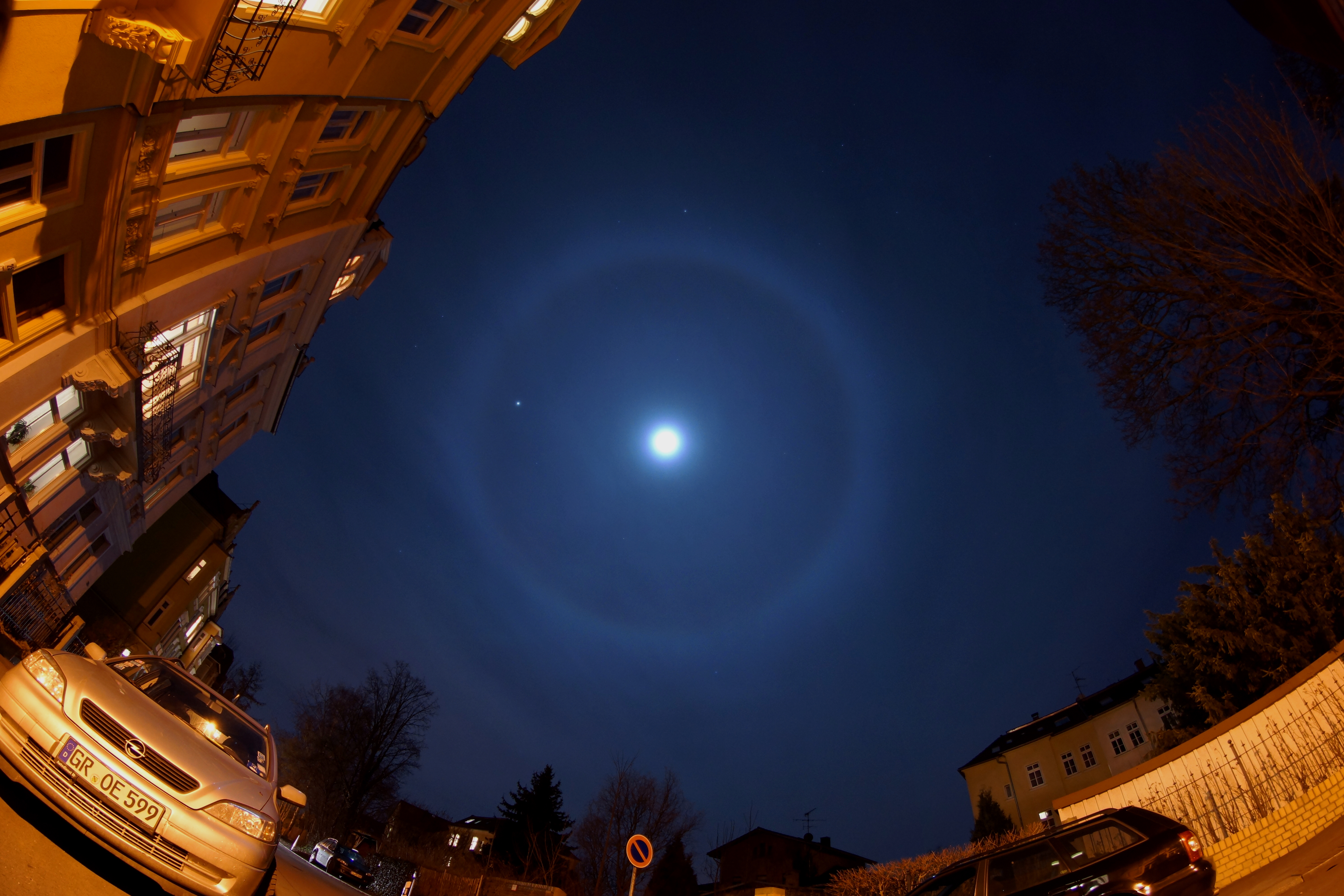 Ein 22-Grad-Mondhalo in 56 Grad Höhe. Mondalter: 9d 21h (77,4 Prozent beleuchtet), Kulmination um 20:18 Uhr MEZ. Jupiter befindet sich 18 Grad weiter westlich und ist -2,6 mag hell.