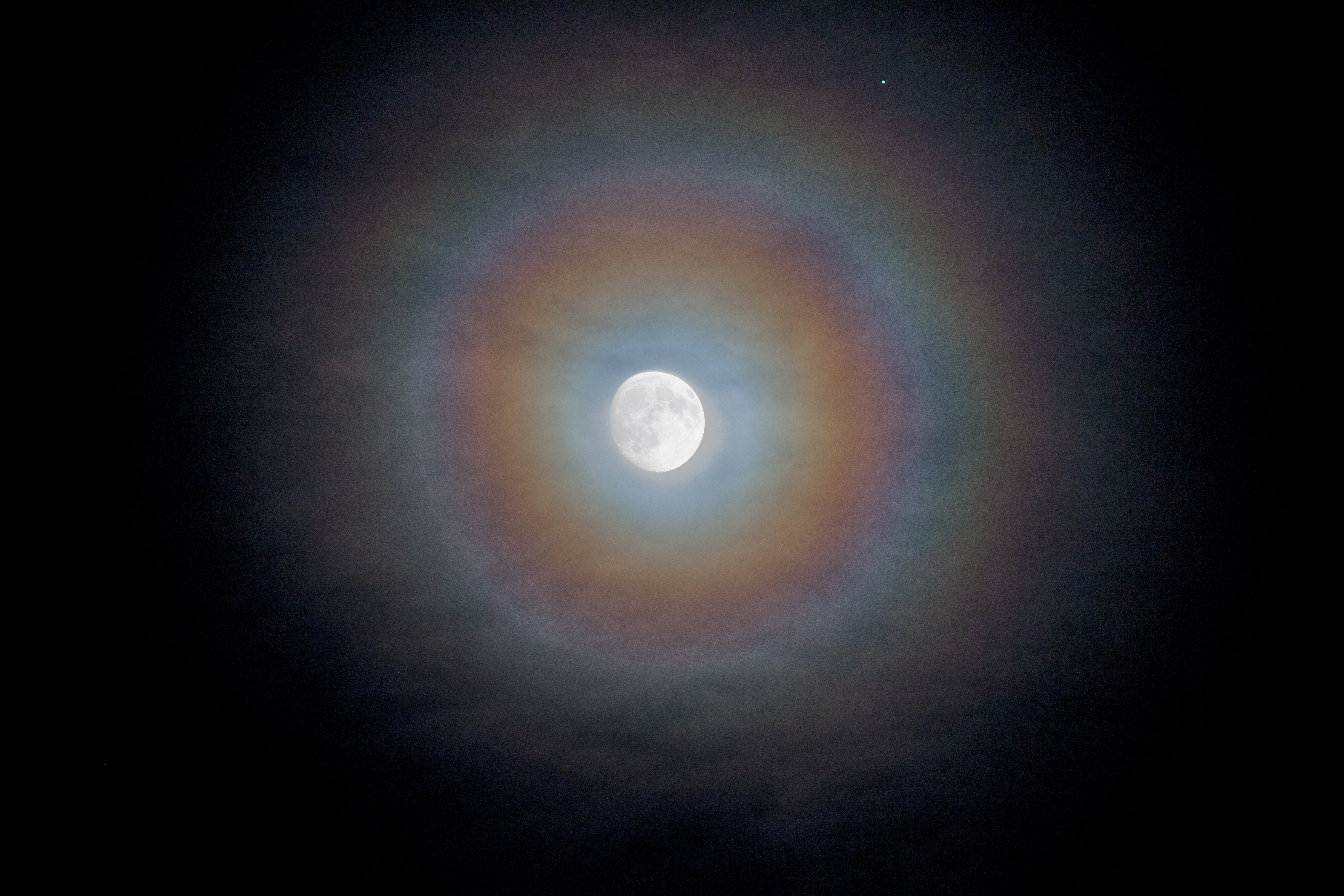 Wollte am Abend des 10. Juni 2014 nach einem Gewitterregen bei guter Durchsicht mit meiner "Russentonne" ein paar Mondbilder machen. Es zogen jedoch hohe Schleierwolken auf, aber zur Entschädigung gab es ein schönes Mondhalo.