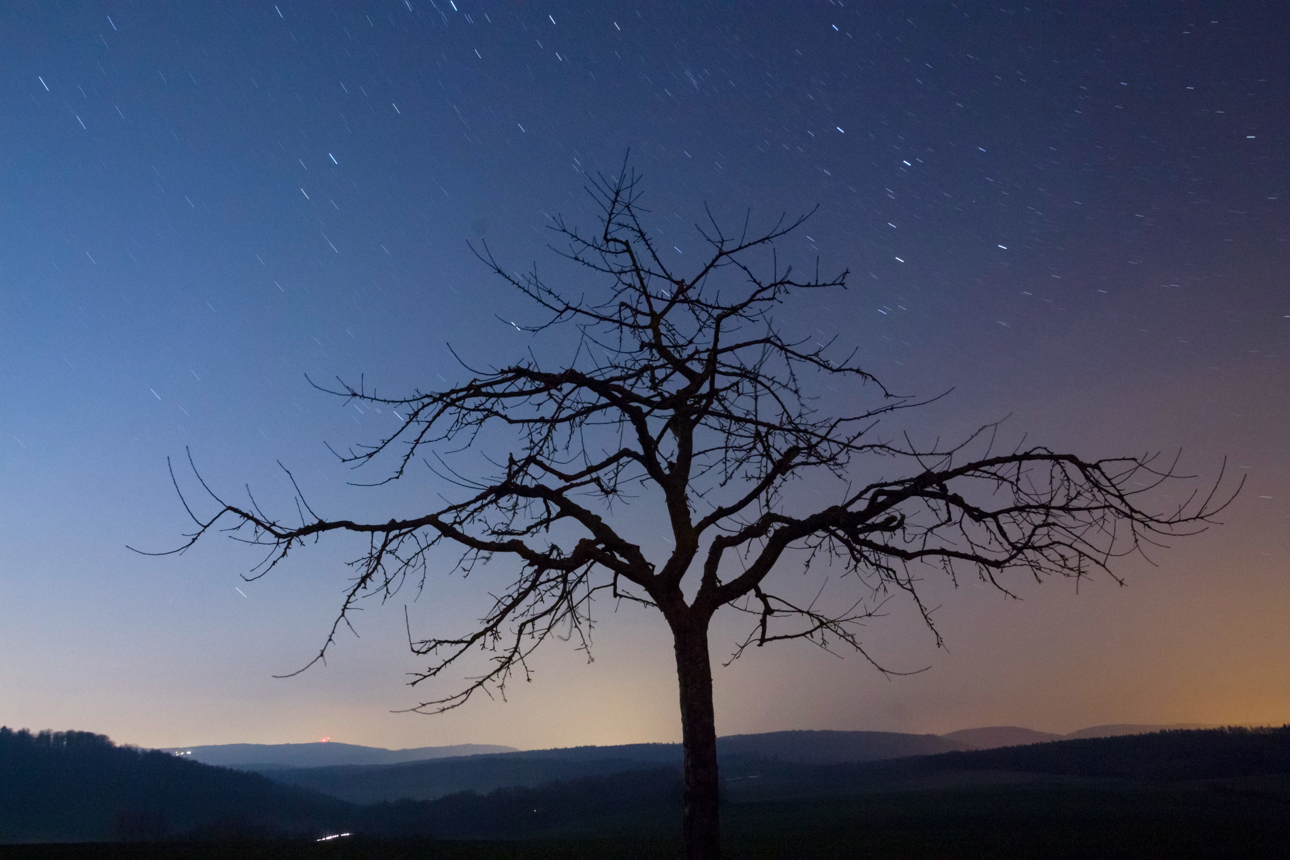 Der helle Mond und die künstliche Beleuchtung lieferten den Hintergrund. Kassiopeia, h+chi Persei und Perseus wandern als Strichspuren über dem Geäst.