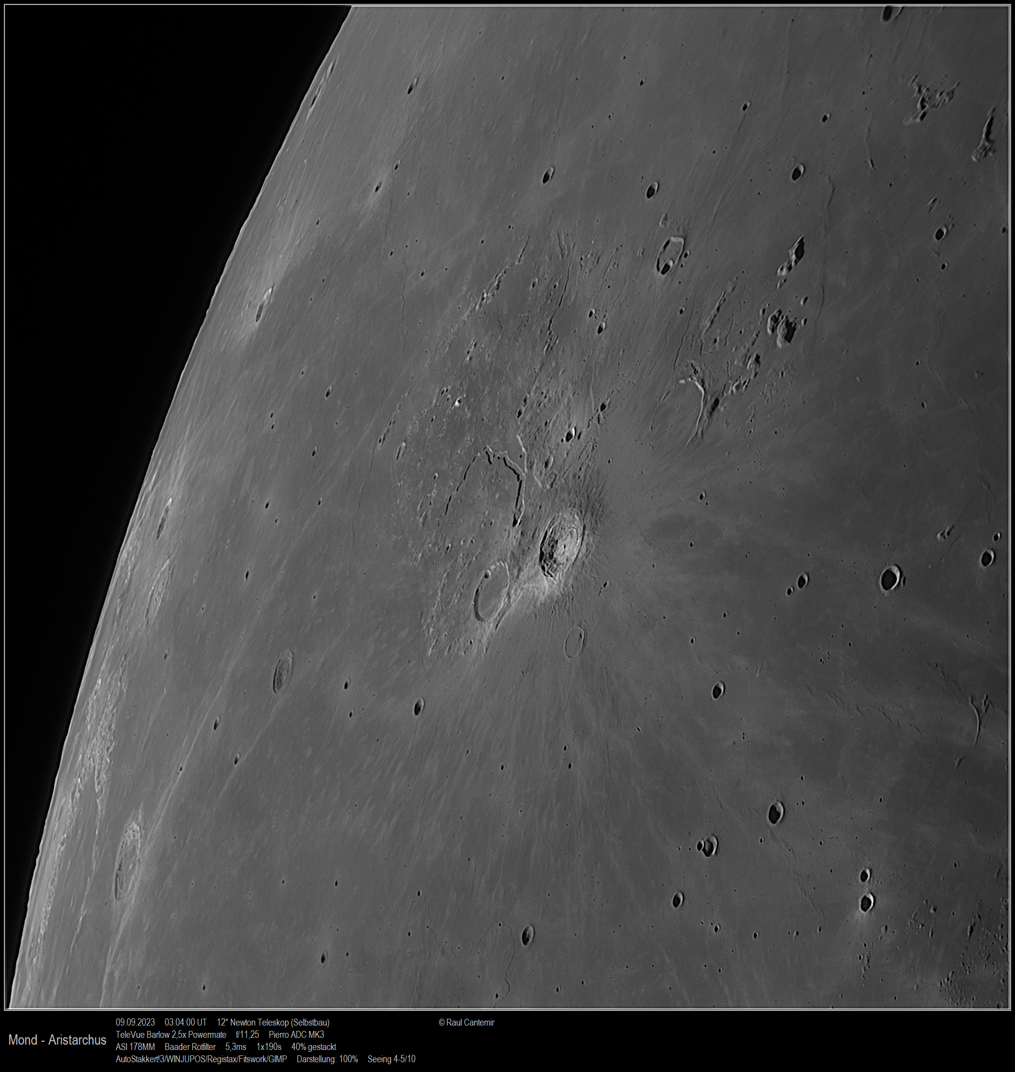 Aristarchus ist der wohl hellste Krater auf der sichtbaren Mondseite und entstand wie die gesamte Region auch vermutlich durch vulkanische Aktivitäten. Der Einschlagkrater hat einen Durchmesser von 46 km und hat in seinem Kraterinneren das hellste Gestein, das von der Erde aus mit einem Teleskop zu sehen ist. Das Bild entstand mit meinem DIY-Newton-Teleskop mit einer Öffnung von 300 mm.