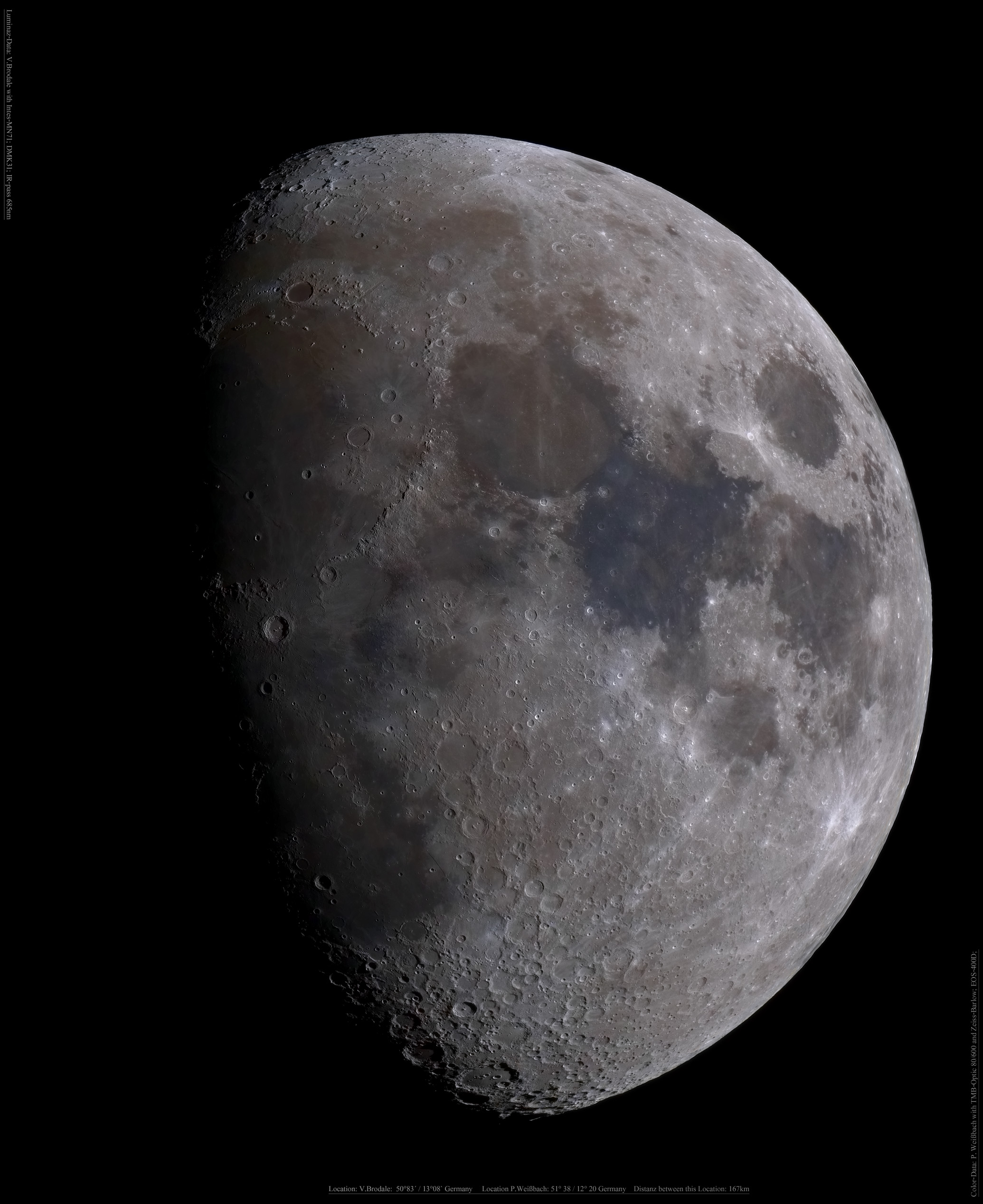 Manchmal braucht es zweier (Hobby)Astronomen, um ein gemeinsames Bild zu erstellen. So in diesem Falle: Am 23.4.2010 hatten Volker Brodale und ich, ohne es von einander zu wissen, am gleichen Abend Bilder vom Mond aufgenommen. Allerdings Volker ein hoch aufgelöstes Mosaik in Graustufen und ich Einzelbilder in Farbe.