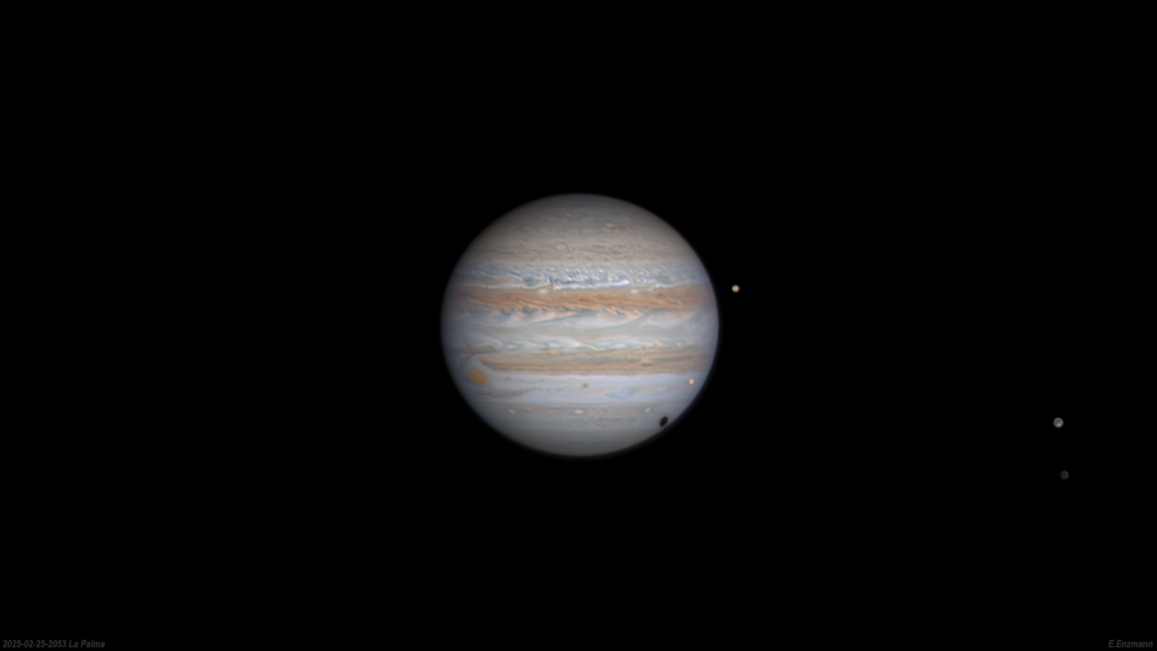 Am 25. Februar 2025 waren gegen 22:00 Uhr Ortszeit alle vier großen Monde von Jupiter sichtbar. Das Wetter hier südlich von München war bedeckt aber in La Palma konnte ich eine Aufnahme davon machen, auch wenn das Seeing nur sehr mittelmäßig war. Zu den vier Monden, Europa vor dem Jupiter, Io gleich rechts neben dem Planeten und weiter rechts der große helle Ganymed und der dunkle Kallisto. Als Bonus gab es noch den GRF und den Schattenwurf von Ganymed auf Jupiter.