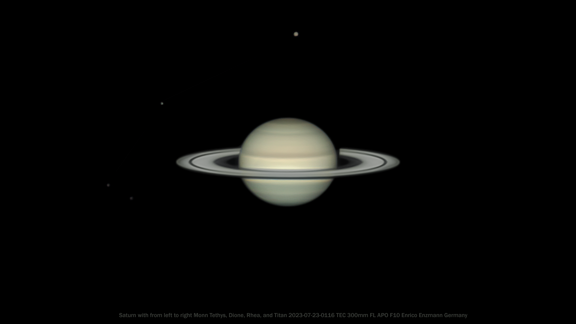 Eine kleine Überraschung war für mich das Saturnbild, das ich am 23. Juli 2023 gegen 3 Uhr mit meinem APO aufgenommen habe. Die Rohdaten ließen nicht auf solch eine gute Bildqualität schließen. Zur Zeit der Aufnahme war Saturn mit fast 31° über Horizont maximal hoch gestanden. Höher kommt er leider nicht bei uns in Deutschland und auch 2024 wird er nur etwa gut fünf Grad höher stehen. Die Monde sind von links nach rechts: Tethys, Dione, Rhea und Titan.