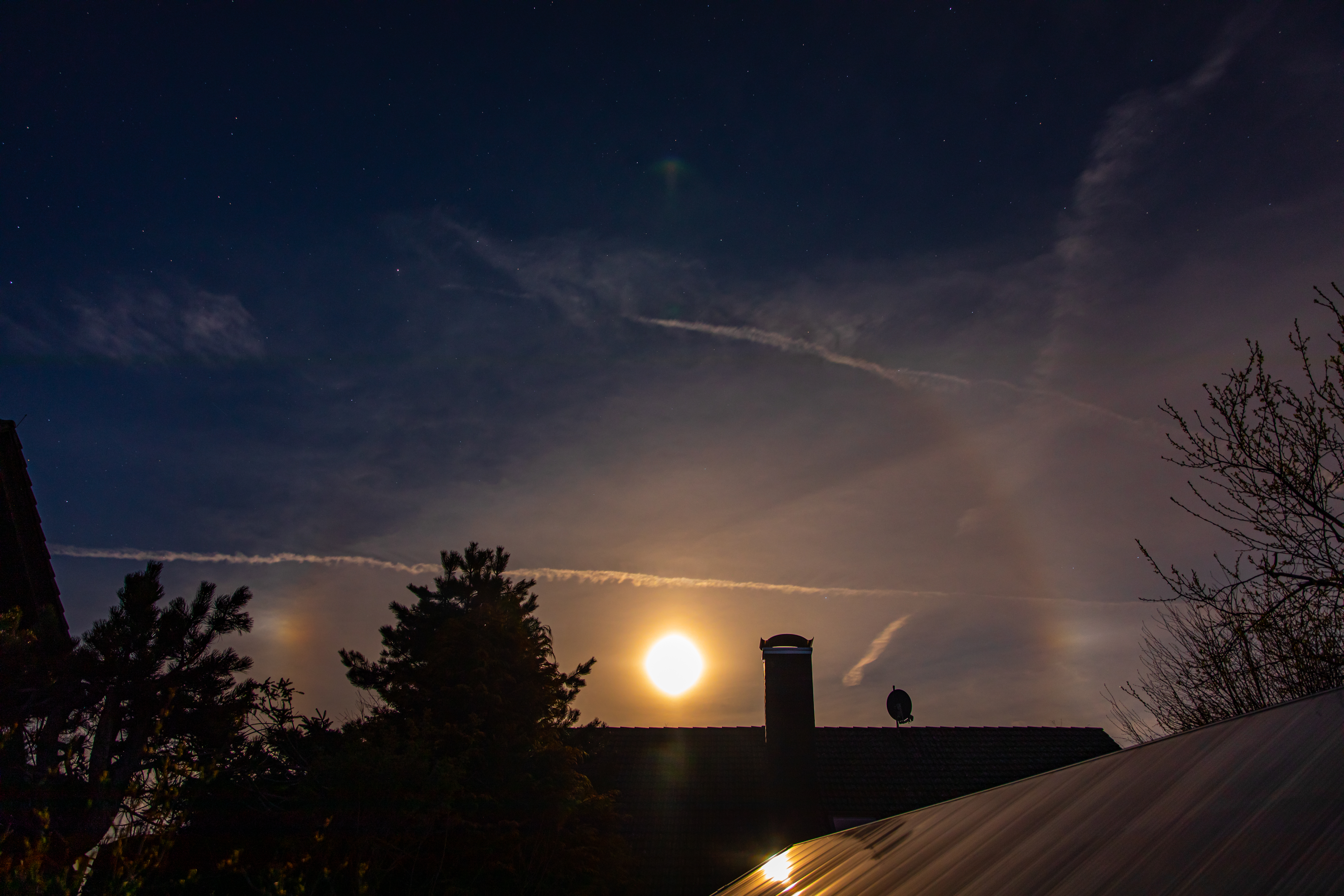 Sah zum ersten Mal einen ausgeprägten Halo um den Mond und zwei "Nebenmonde". Vermutlich durch Schleierwolken und vielleicht auch durch Saharastaub bedingt. Leider dauerte alles nur wenige Minuten.