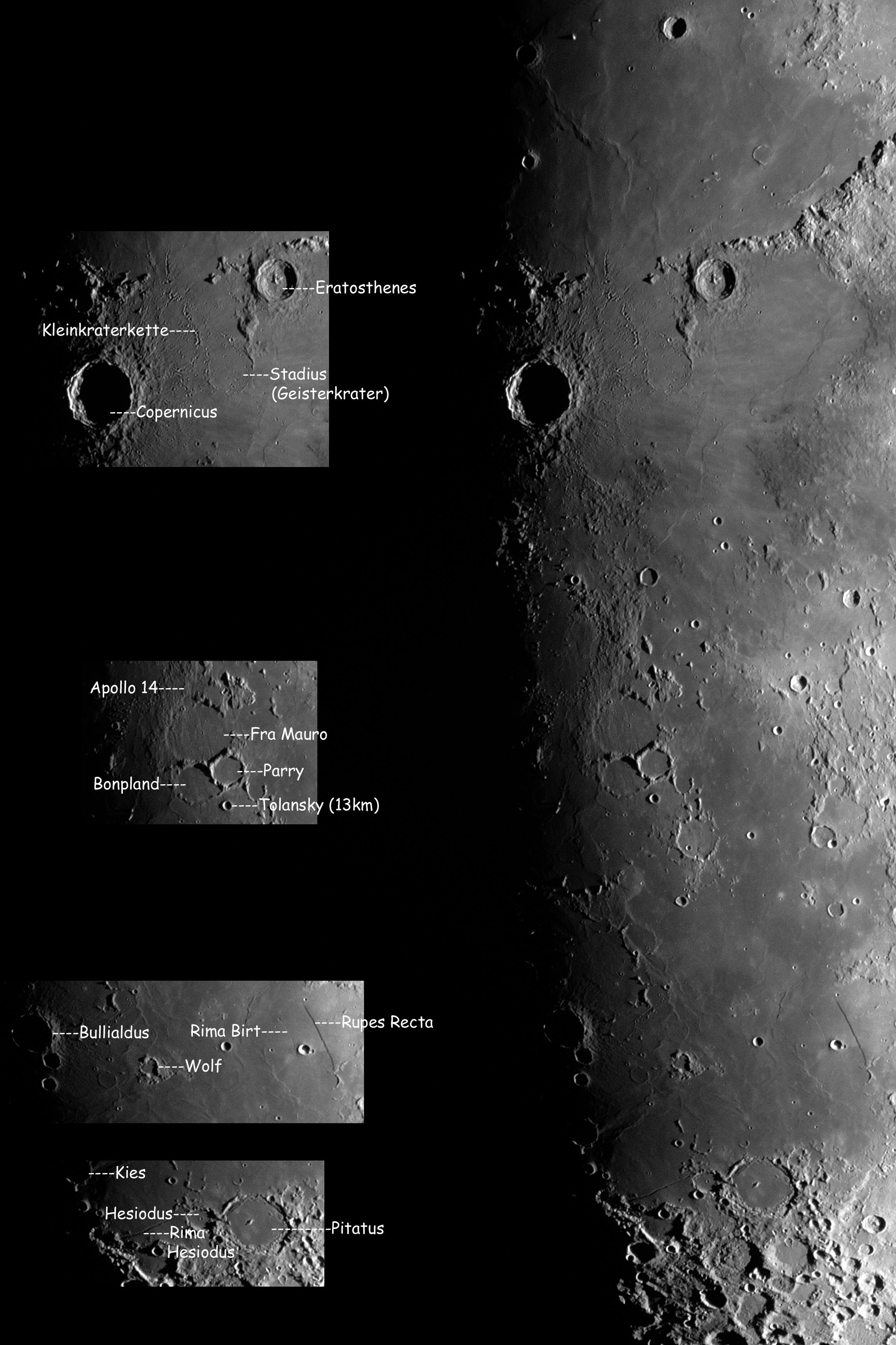 An diesem Tag habe ich viel visuell beobachtet. Vor allem der Krater Fra Mauro und Umgebung mit seinen schönen Rillen und Kleinkratern war ein wunderschöner Anblick. Natürlich durfte die Landestelle von Apollo 14 nicht fehlen, auch sie wurde aufgesucht. Und ein paar Fotos habe ich auch aufgenommen und daraus dieses Übersichtsbild zusammen gestellt.