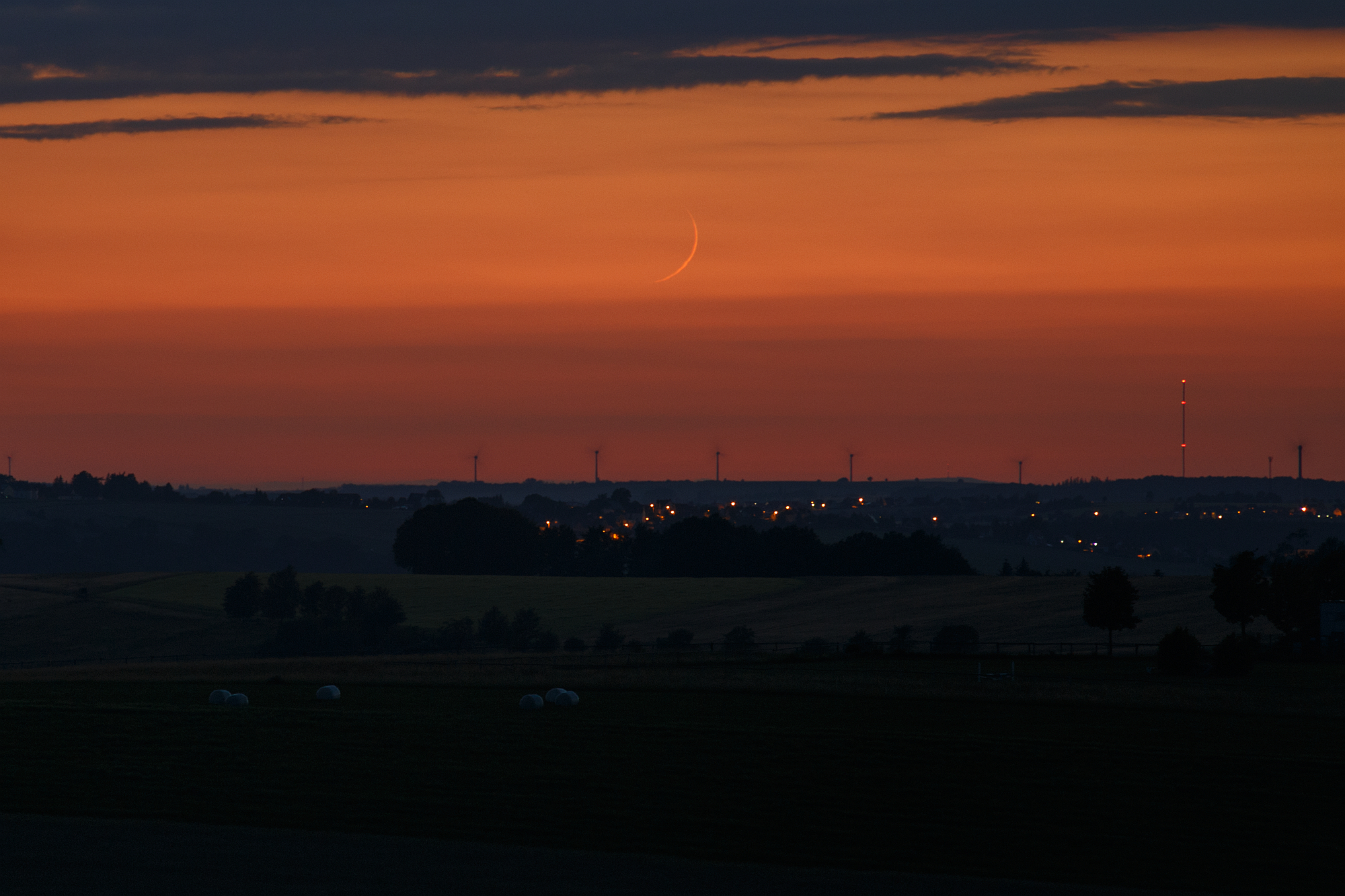 Die hauchdünne Mondsichel am Abend des 22. Juni 2020, 38 h nach Neumond und der ringförmigen Sonnenfinsternis. Zum Aufnahmezeitpunkt befand sich der Mond nur noch 1,1 Grad (!) über dem Horizont und war zu 2,8 Prozent beleuchtet. Der hohe, befeuerte Mast rechts ist die Antenne des ehemaligen Mittelwellensenders in Wilsdruff (1044 kHz).