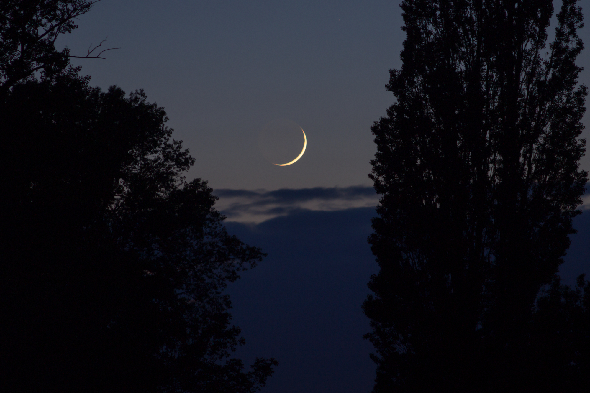 Einen erneut sehr schönen Anblick bot am Abend des 6. Mai 2019 die sehr schmale Sichel des zunehmenden Mondes, nur 45h nach Neumond. Man spürt, die Ekliptik wird wieder flacher am Abendhimmel … Beim Stern rechts oberhalb der Sichel handelt es sich um Ain (Oculus Boreus), der rechte Stern des V des Stiers.