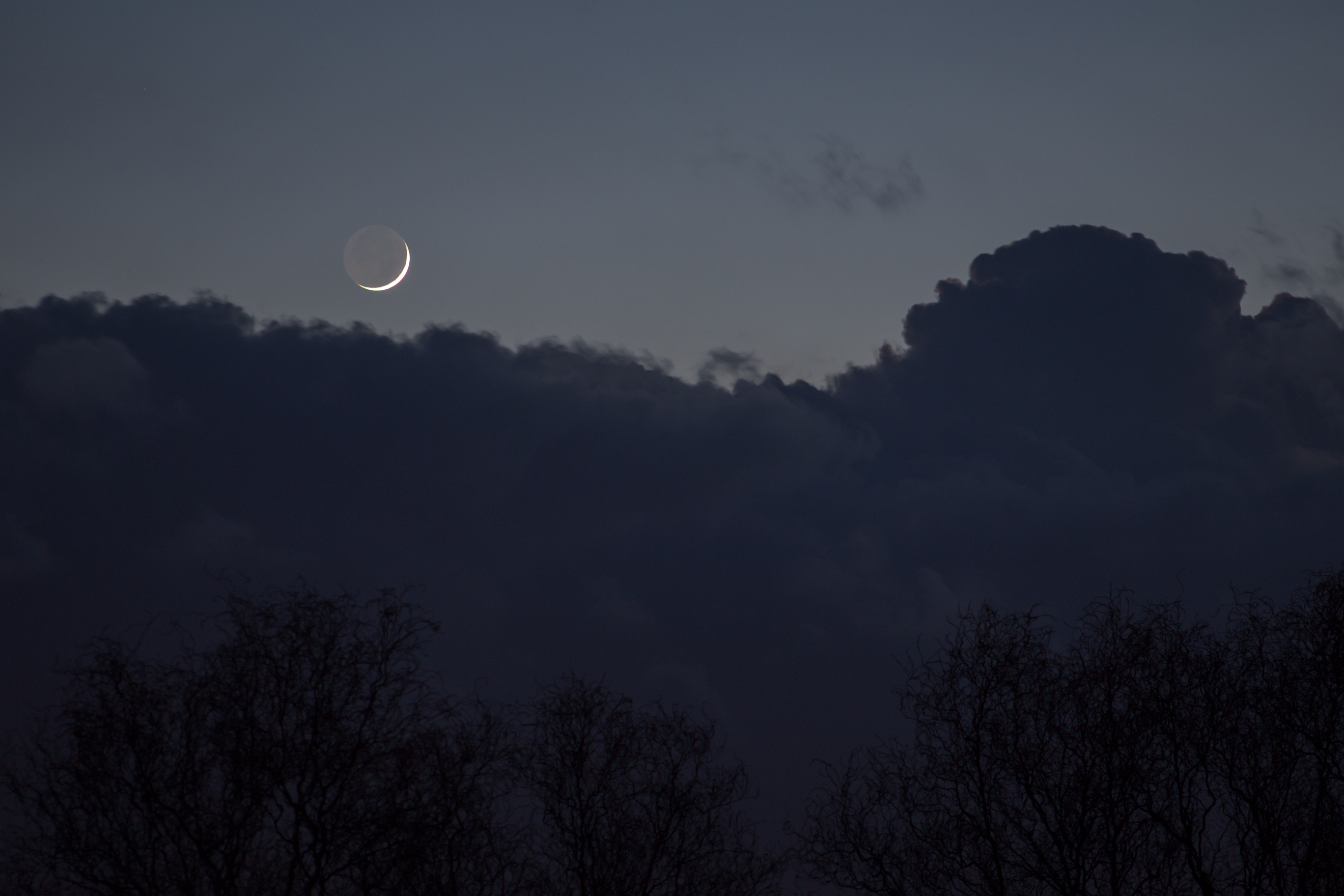 Auch im März war es möglich, eine sehr schmale Mondsichel, nur 48h alt, am Abend des 8. März 2019, zu bewundern. Ich schaffte es gerade noch rechtzeitig, Kamera und Stativ aufzubauen, bevor eine aus Westen näherrückende Wolkenfront den Blick versperrte. Die Durchsicht war dennoch perfekt, das aschgraue Licht erneut eine Augenweide. Mächtige Haufenwolken gaben der Szenerie am Abendhimmel den letzten Schliff. Durch eine optische Täuschung, Irradiation, scheint die Sichel stets größer zu sein als der übrige Teil der Mondscheibe. Fotos belegen, dass dies natürlich nicht der Fall sein kann …