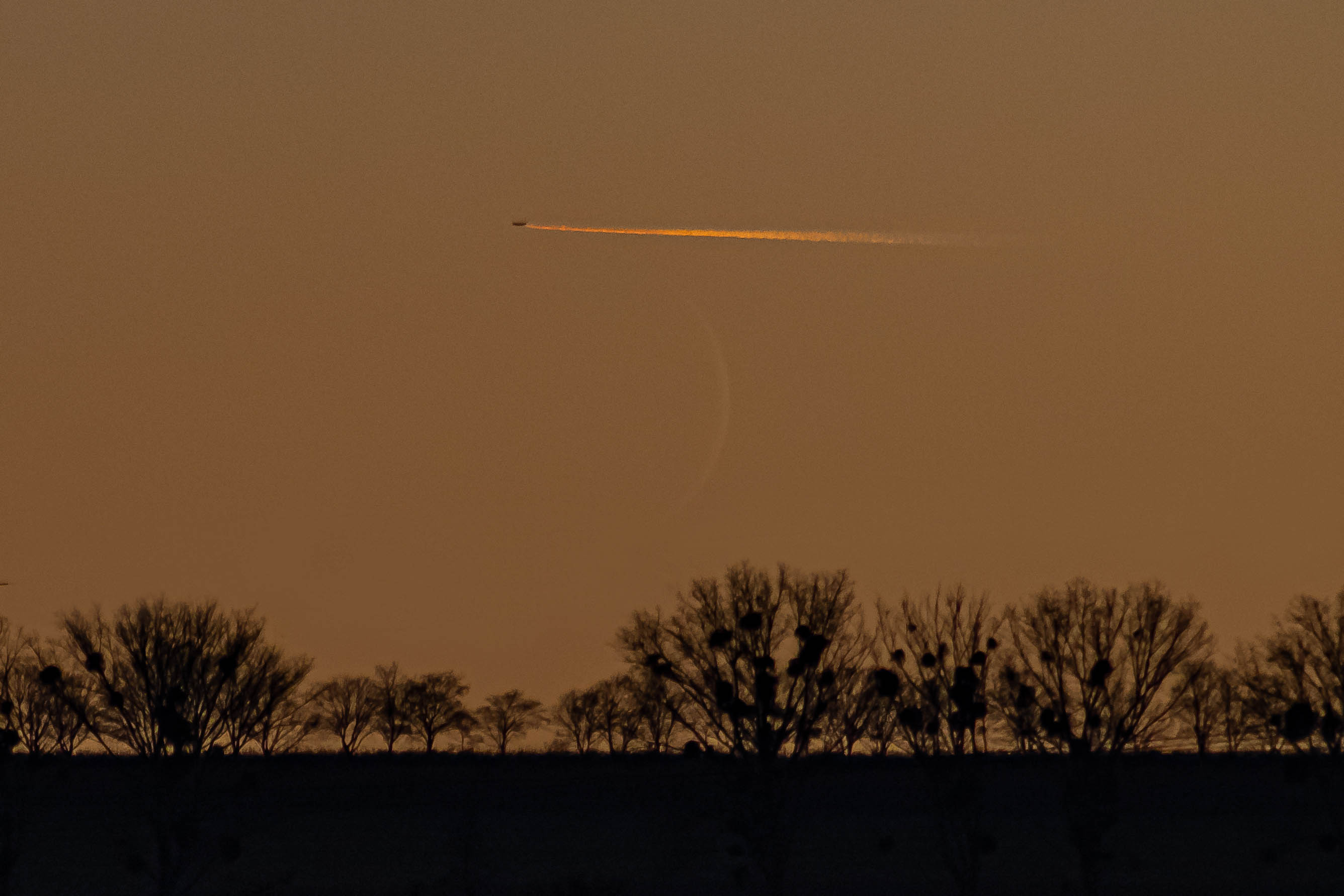 56,5 Stunden nach Neumond zeigte sich die Mondsichel wieder am Abendhimmel. Die Beobachtung war sehr schwierig da die Sonne gerade einmal 1,3 Grad unter dem Horizont stand und der zu 5% beleuchtete Mond nur noch eine Höhe von 2,7 Grad hatte. Die abendliche Ekliptik liegt in dieser Jahreszeit sehr flach über dem Horizont und zusätzlich war die Mondposition auch noch etwas mehr als 5 Grad darunter.