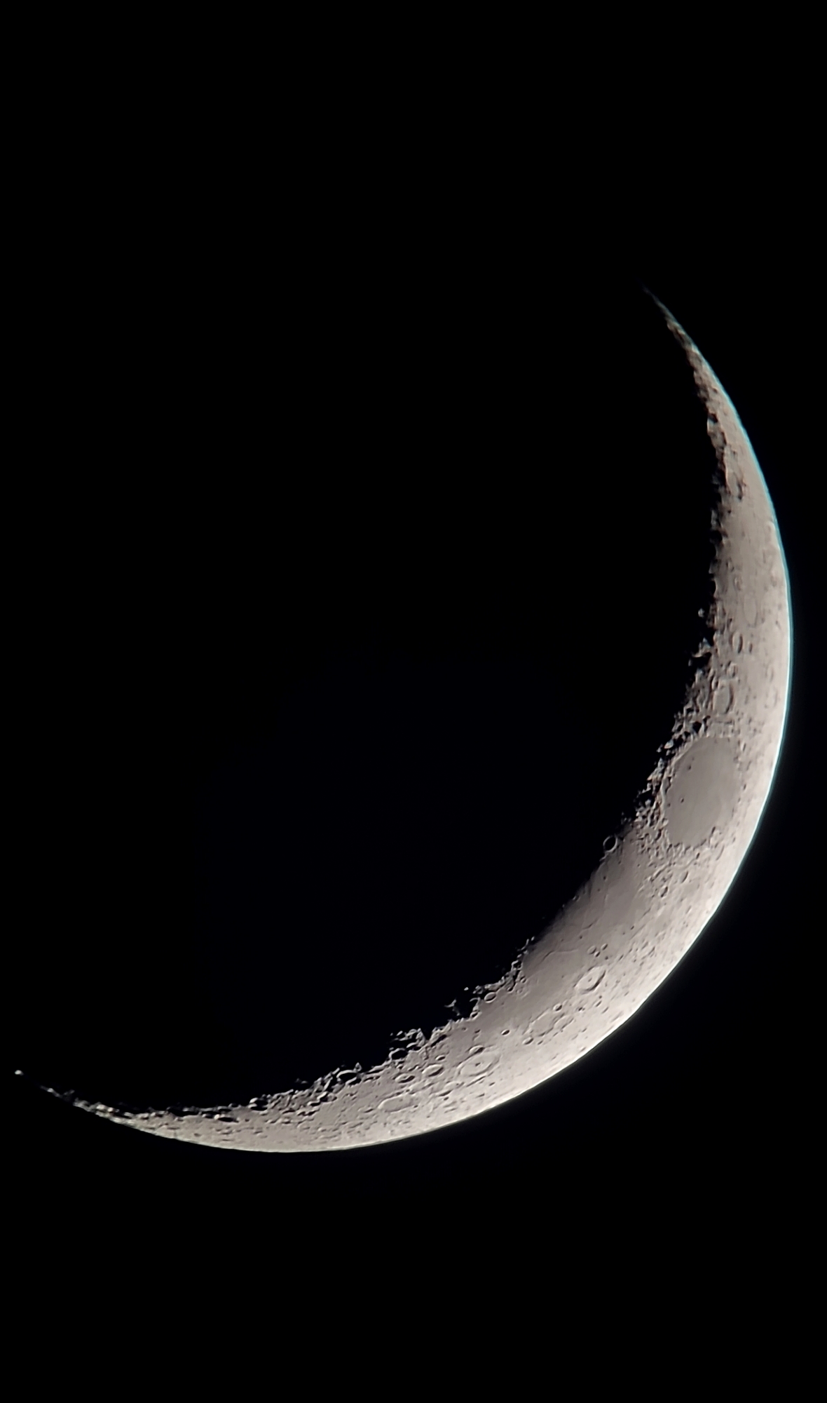 Am Samstag entstand dieses Bild der Mondsichel. Es ist mit einem 15-cm-Maksutov Intes MK-65 und einem hinter dem Okular befestigtem Handy aufgenommen. Belichtet wurde 1/125 sek bei ISO 1000.