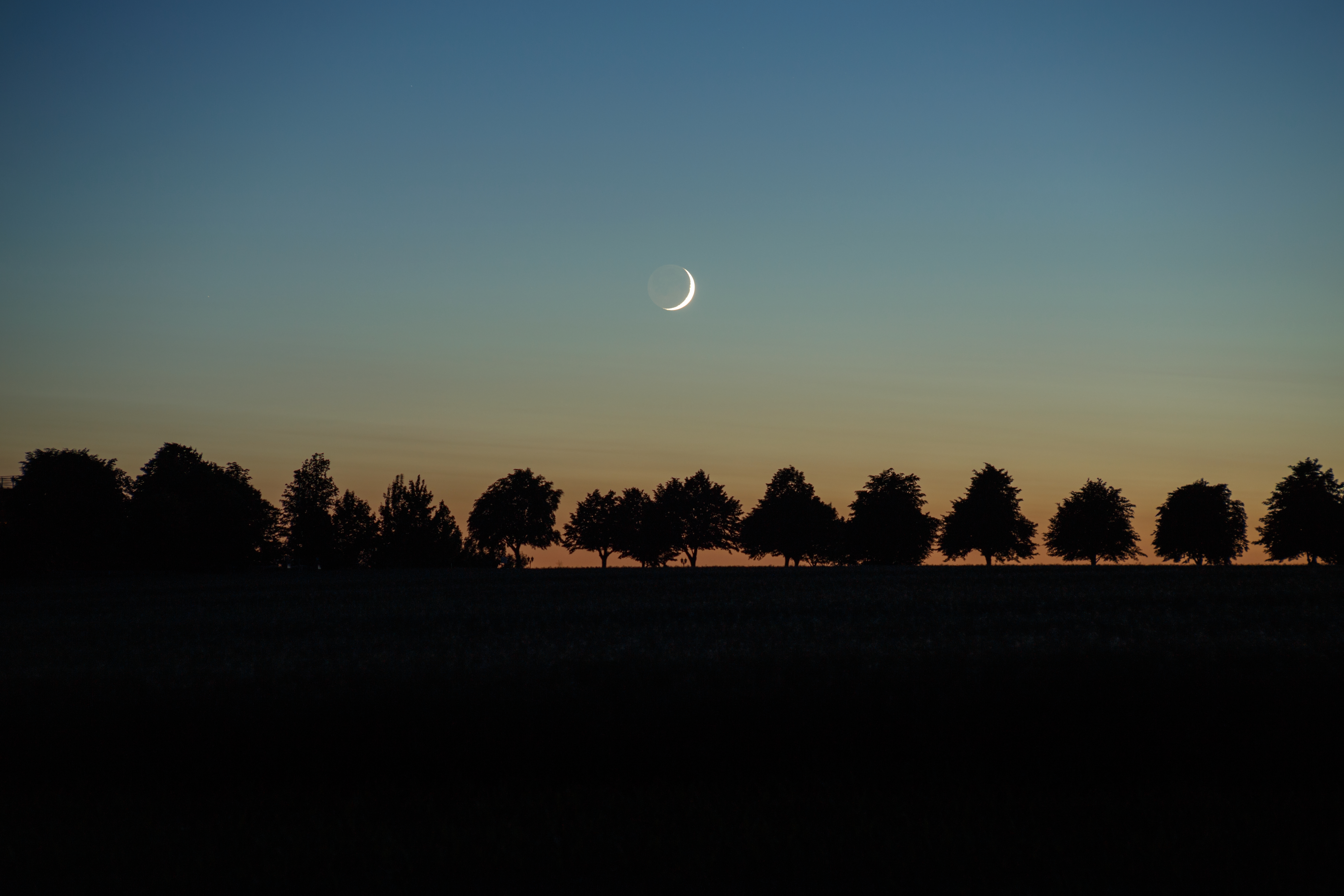 Auch am Abend des 23. Juni 2020 war die Mondsichel noch sehr fotogen, diesmal kam das aschgraue Mondlicht gut zur Geltung. Einsam und verlassen stand sie am Himmel. Es war ein ungewöhnlich klarer Abend mit sehr transparenter Luft … Auf dem Lerchenberg bei Börnchen in Sachsen ergab sich eine wunderschöne Kulisse für die Mondsichel.