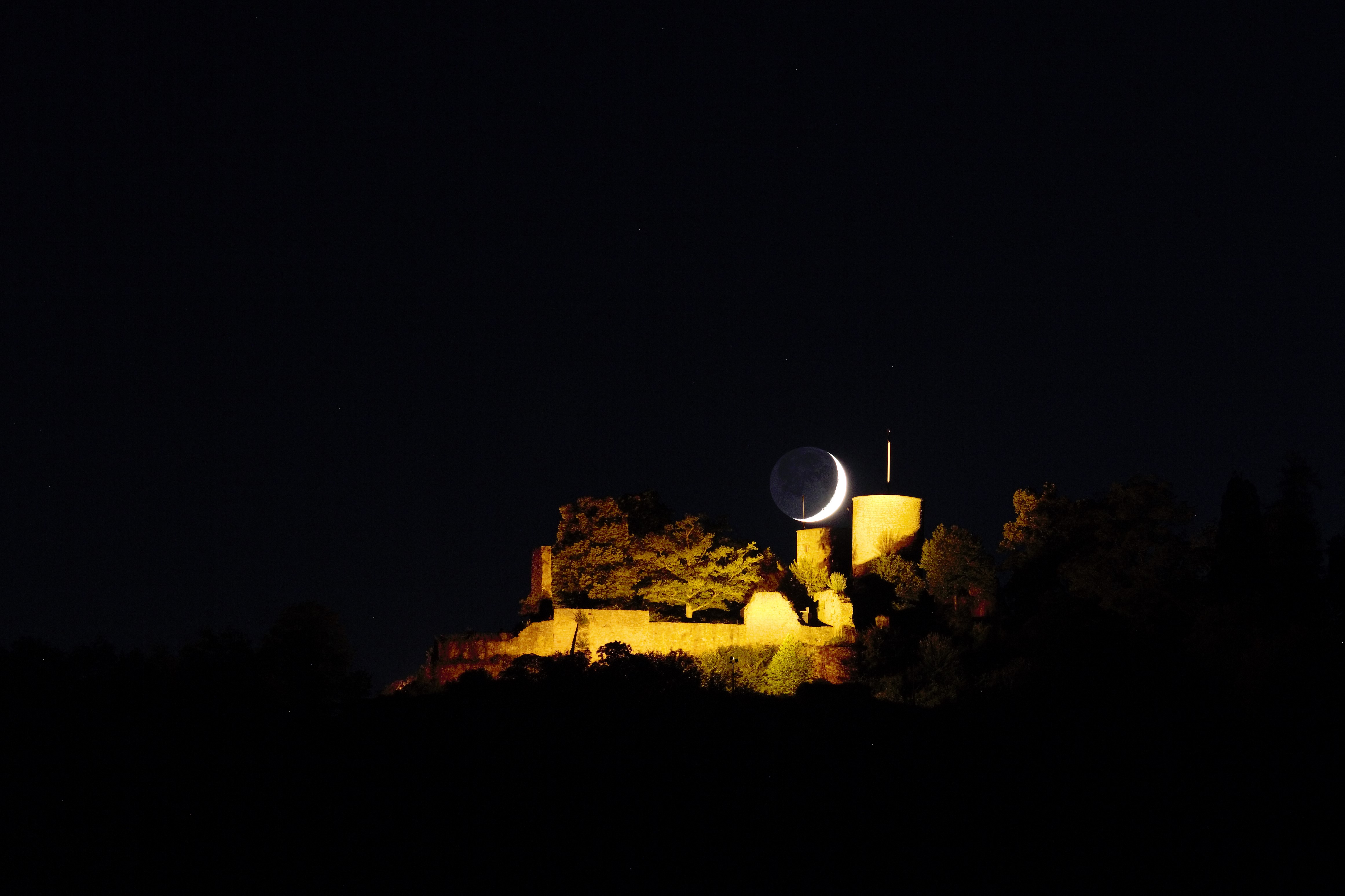Die drei Tage alte Mondsichel ganz nahe bei der beleuchteten Burg.