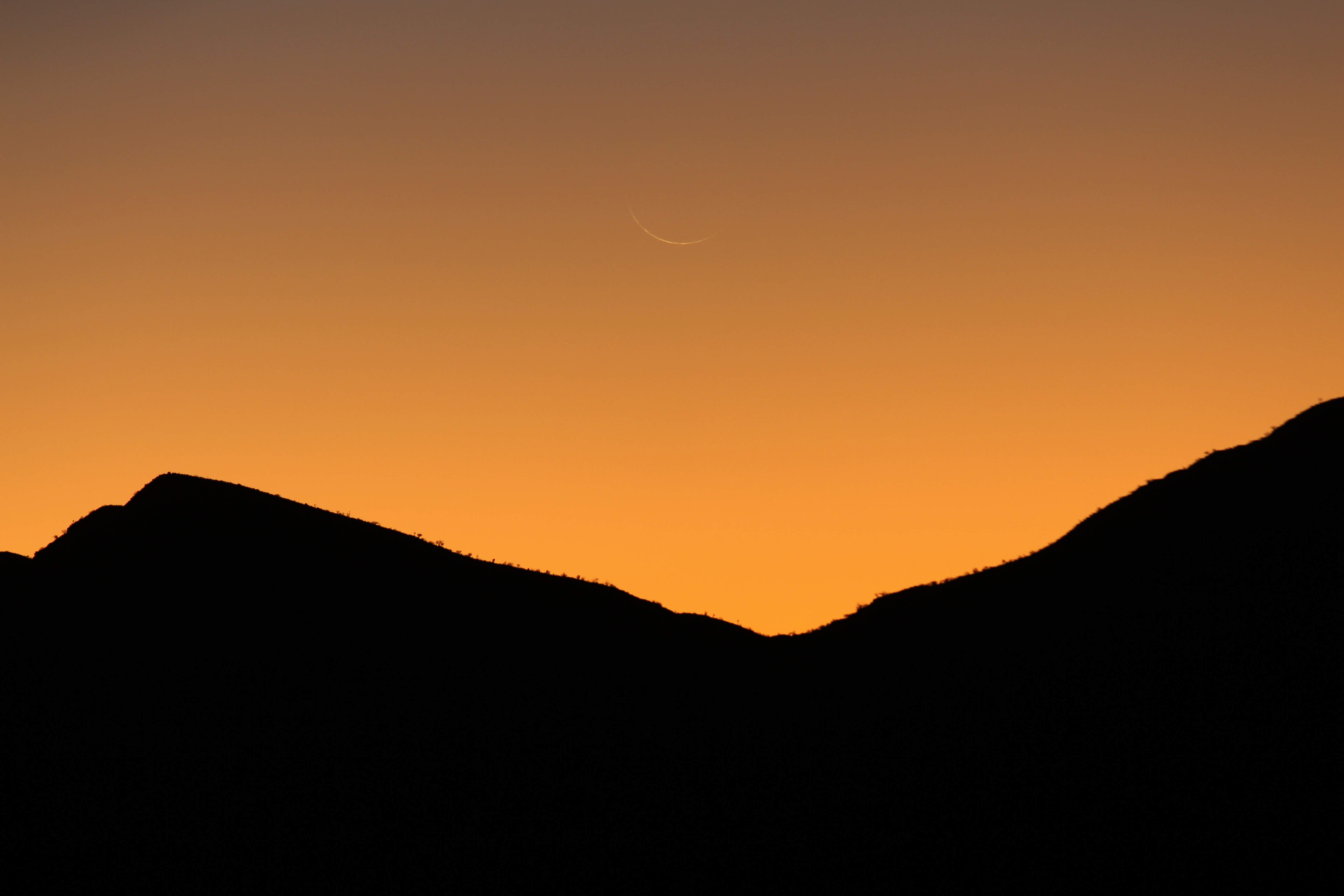 Bei der SuW-Leserreise 2019 nach Namibia bot auch der zunehmende Mond einen so noch nie gesehenen Anblick. Die hauchfeine, nur 21 h alte Mondsichel zeigt sich am goldenen Abendhimmel über den Hakosbergen.