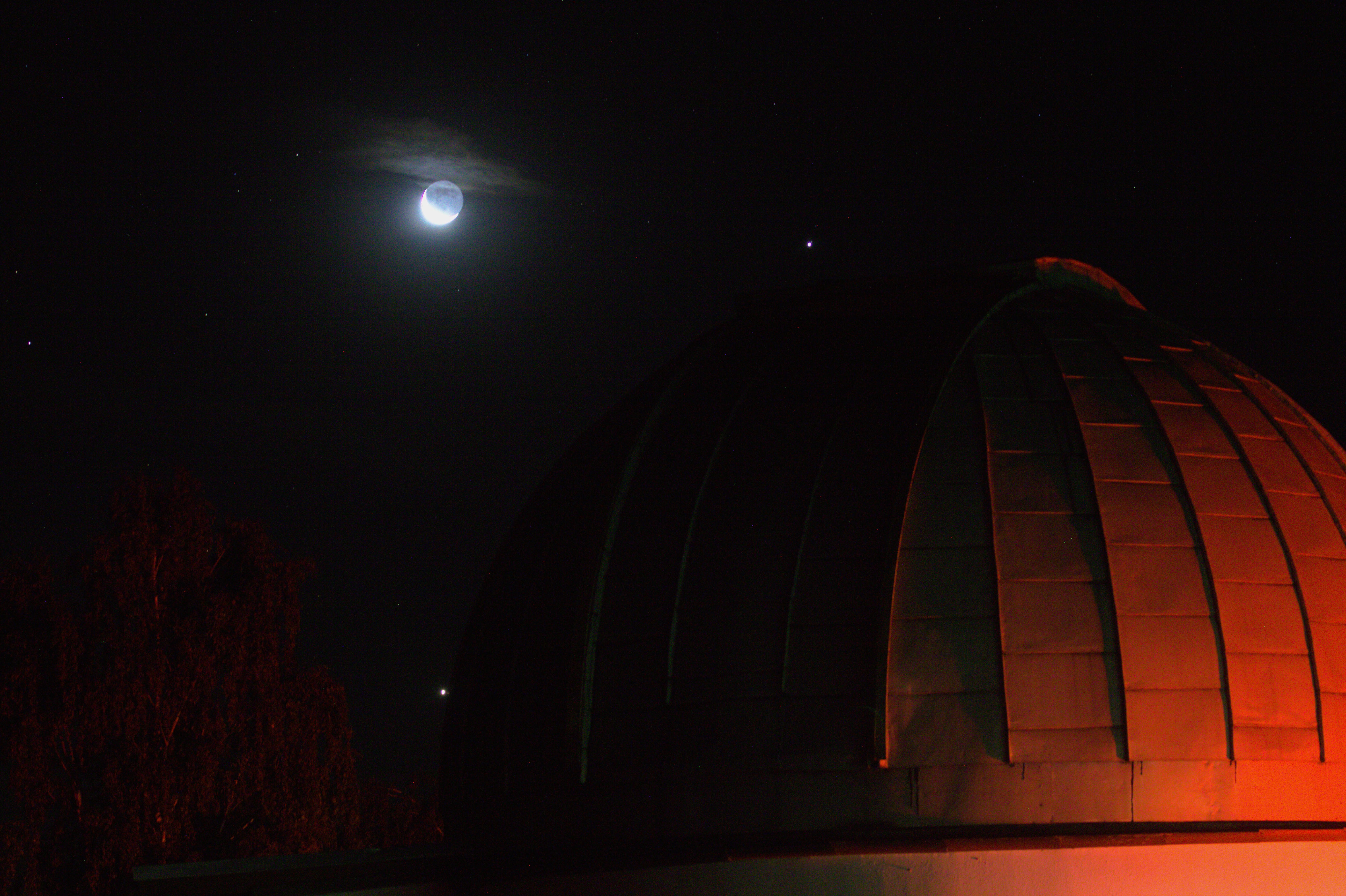 Am 20. August morgens um 4:30 Uhr: Jupiter und Venus umrahmen die Kuppel der Sternwarte in Kirchheim (Thüringen) und die Mondsichel steht abseits.
