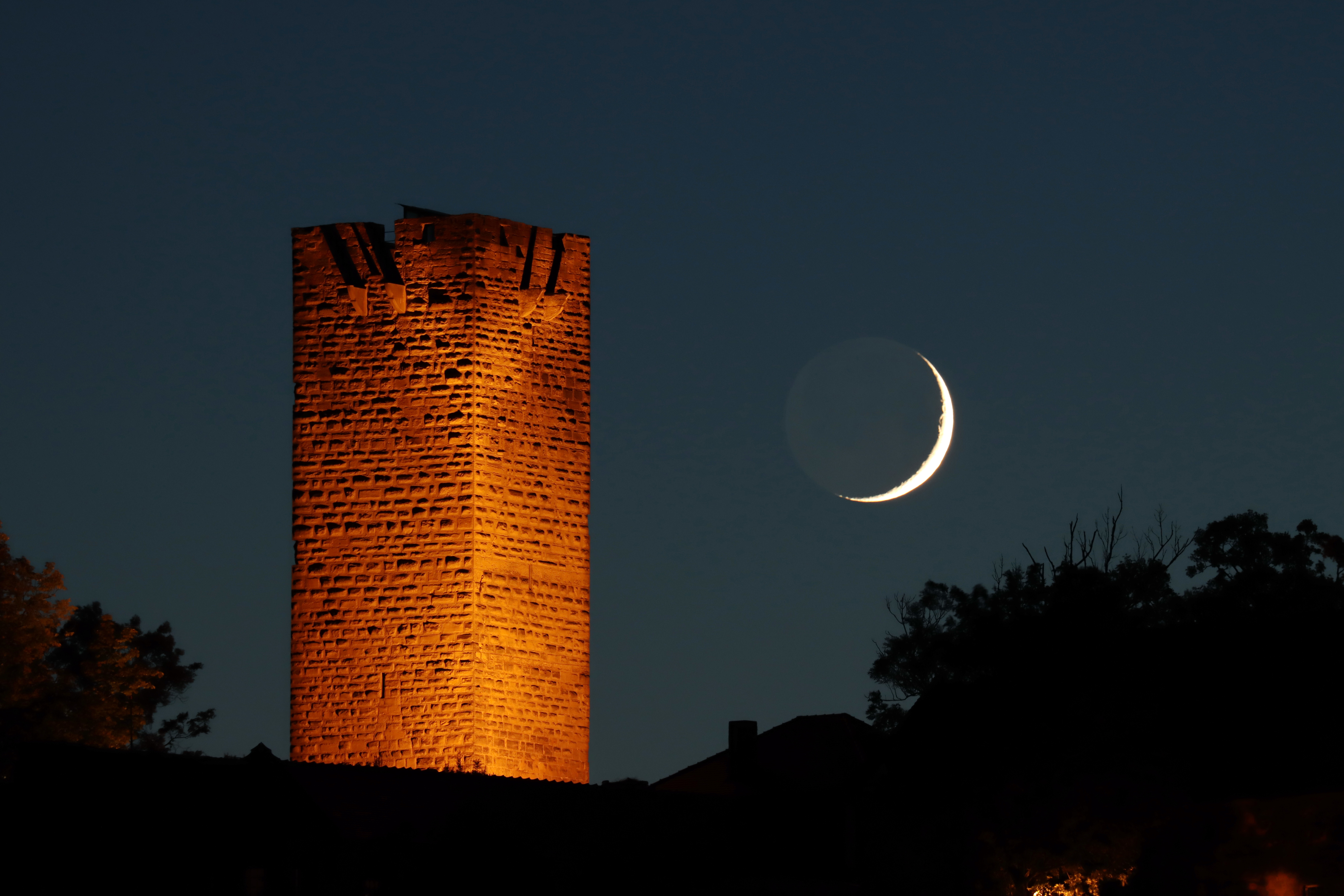 Die 2,5 Tage alte Mondsichel mit deutlichem aschfahlen Mondlicht steht unmittelbar neben dem beleuchteten Turm der Ravensburg. Die aus dem 13. Jh. stammende Ravensburg überragt Sulzfeld und bietet eine großartige 360-Grad-Rundumsicht über den gesamten Kraichgau. Um den Mond mit Tele in der Nähe eines Bauwerks zu fotografieren ist es erforderlich auf wenige Meter und wenige Minuten genau am richtigen Standort zu sein.