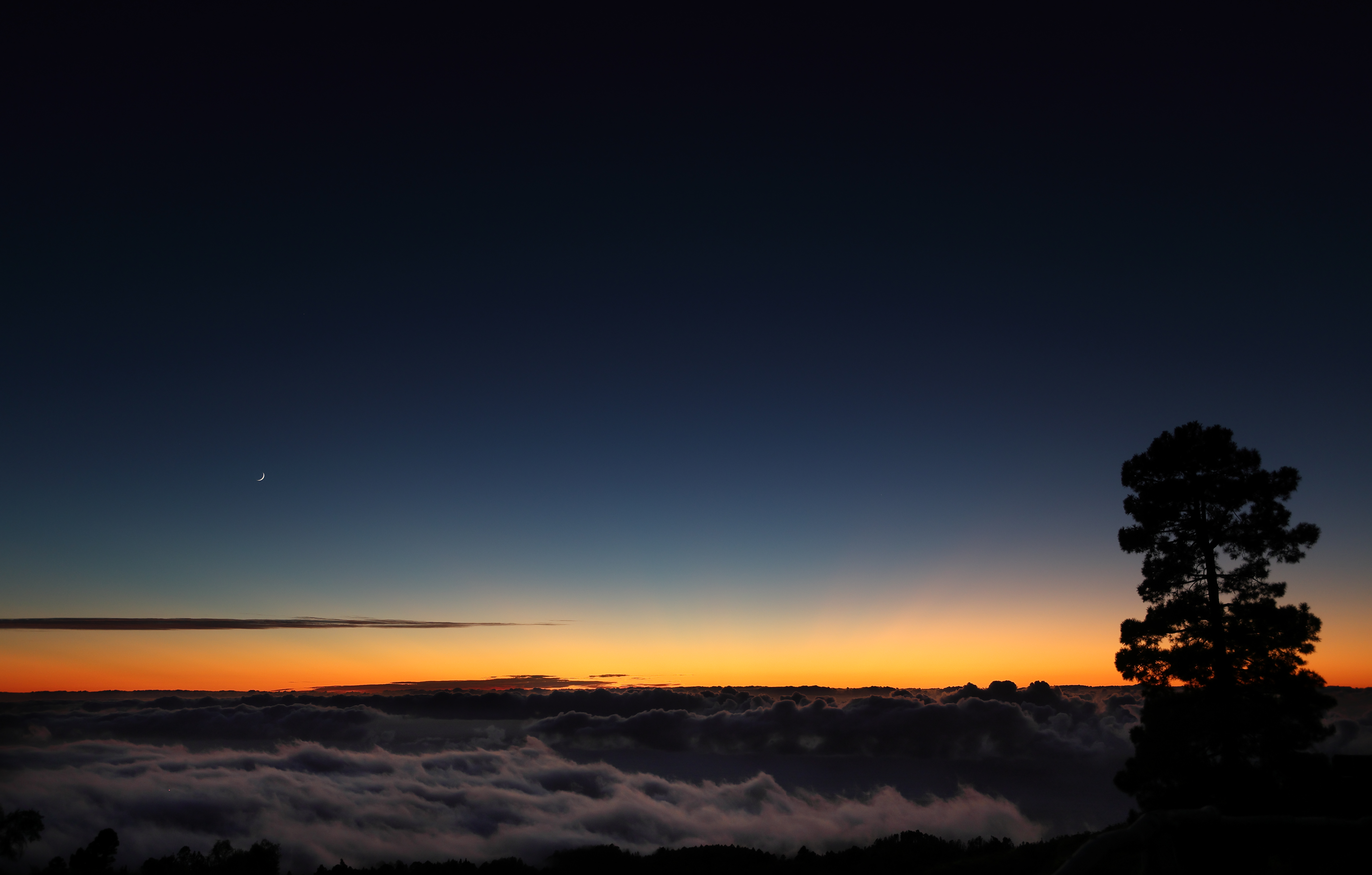 Die zwei Tage alte Mondsichel über dem Atlantik, aufgenommen im Norden der Insel La Palma auf etwa 1500 m Höhe. Eine halbe Stunde vorher war die Sonne untergegangen. Die Farben des Himmels waren märchenhaft.