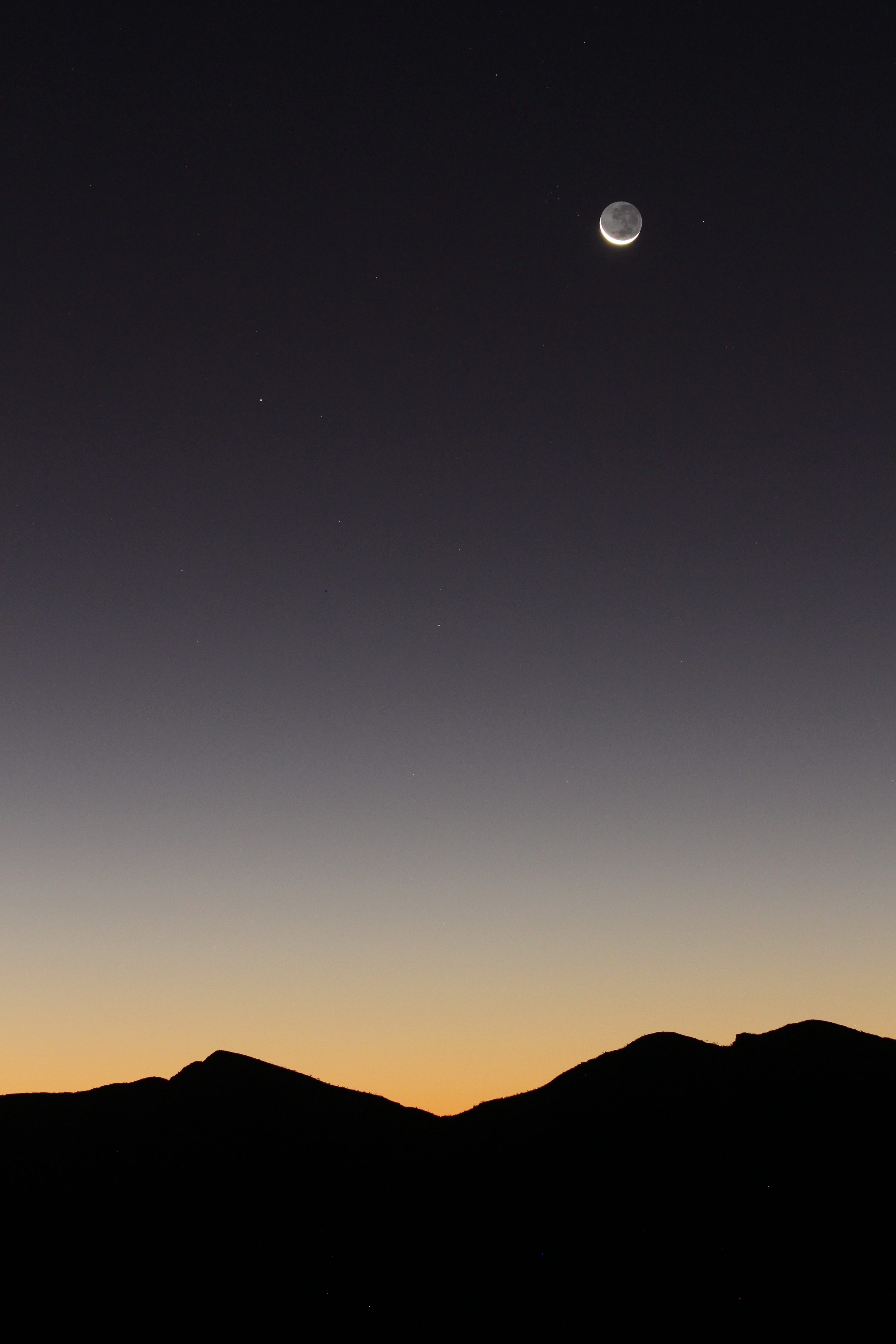 Bei der SuW-Leserreise nach Namibia zeigt sich von der Farm Hakos aus eine sehr schöne Konstellation des zunehmenden Mondes als feine Sichel mit sehr deutlichem aschfahlen Mondlicht und Merkur (links) und Mars (unten) über den Hakosbergen.