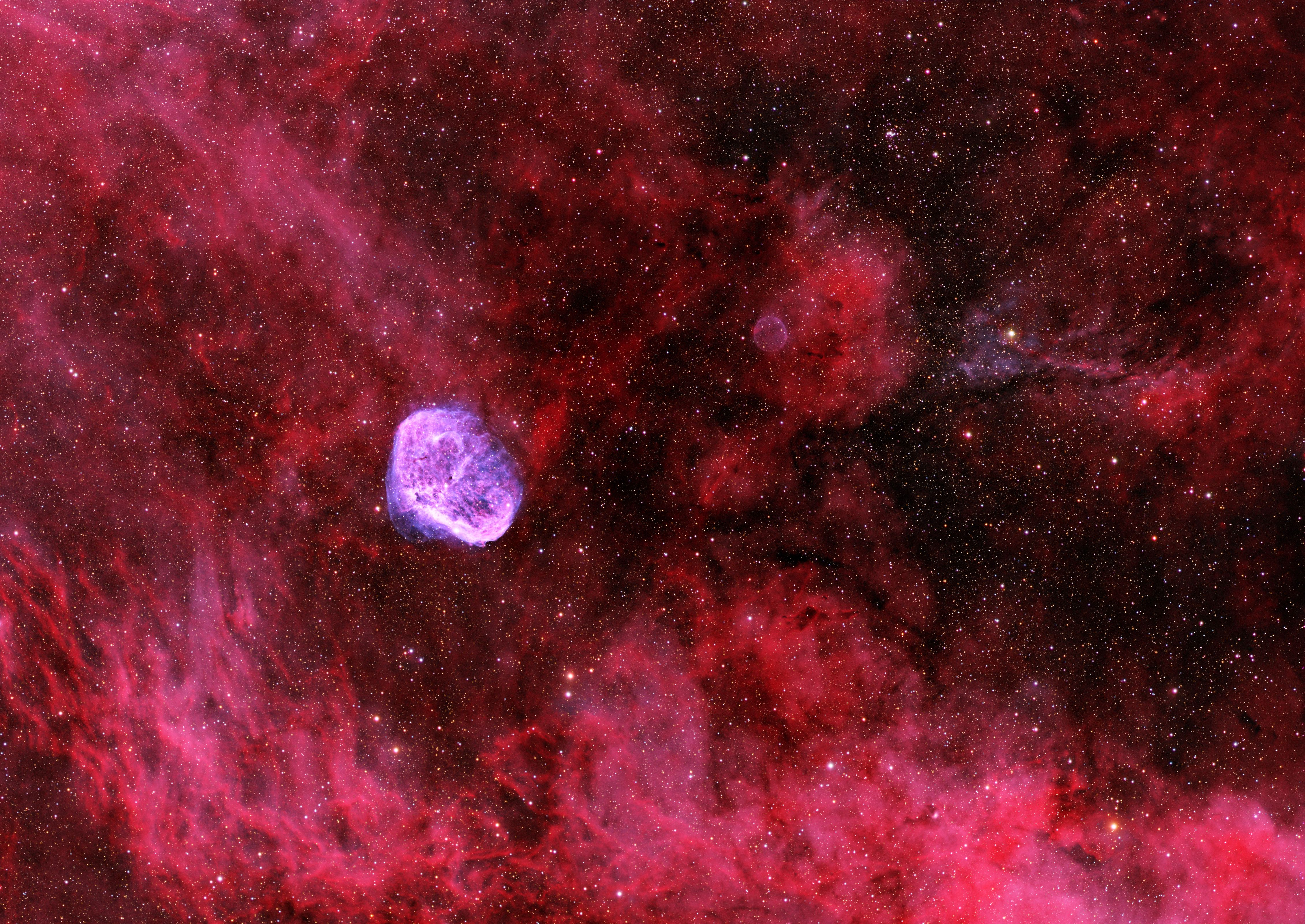 Der Seifenblasennebel wurde erst 2007 von einem amerikanischen Amateurastronomen entdeckt und ist ein äußerst unauffälliger Nachbar des Mondsichelnebels NGC 6888, der vor allem im OIII leuchtet.