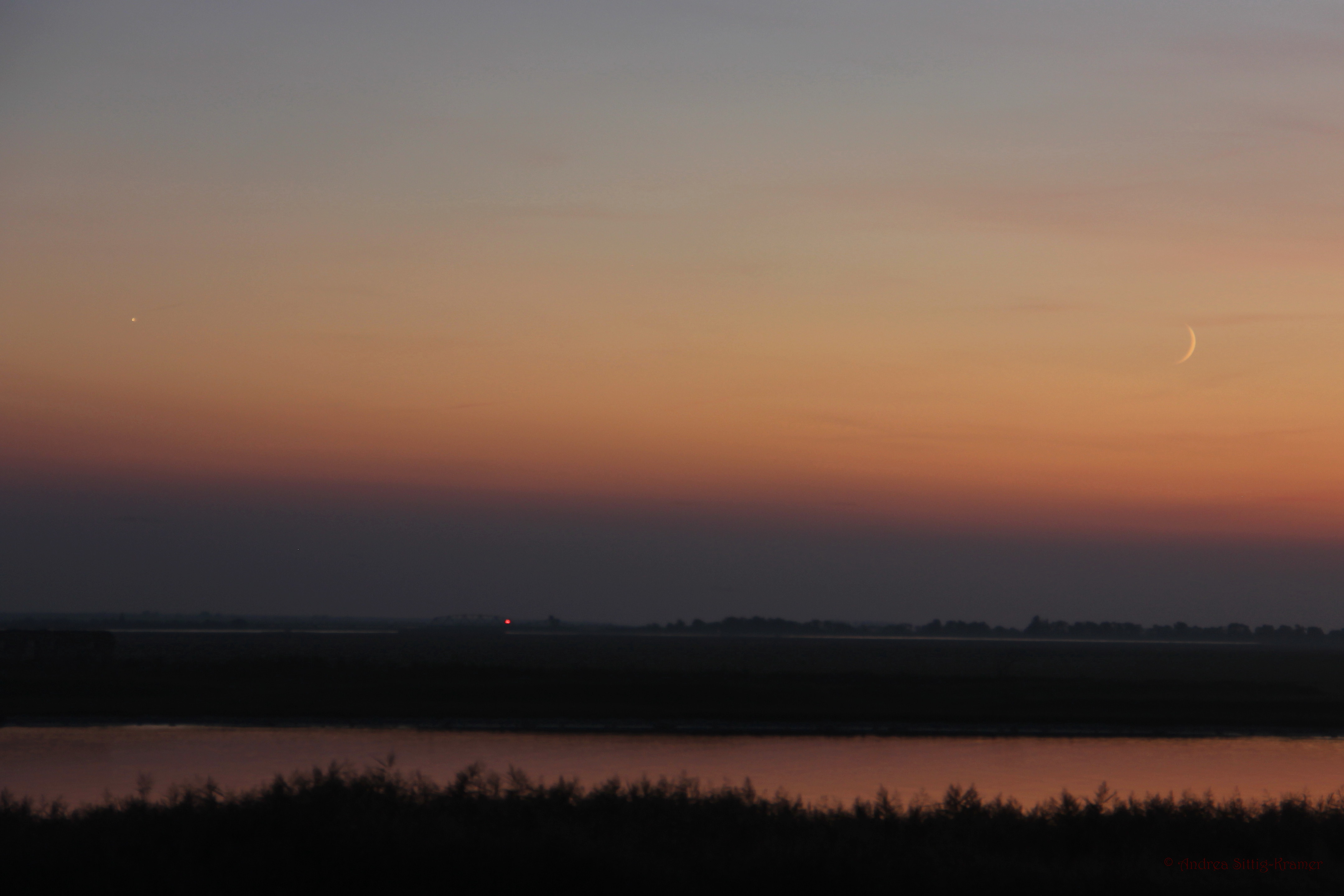 Die junge Mondsichel und die Venus waren nach einem farbenprächtigem Sonnenuntergang von Zingst aus gut über dem Bodden zu sehen.