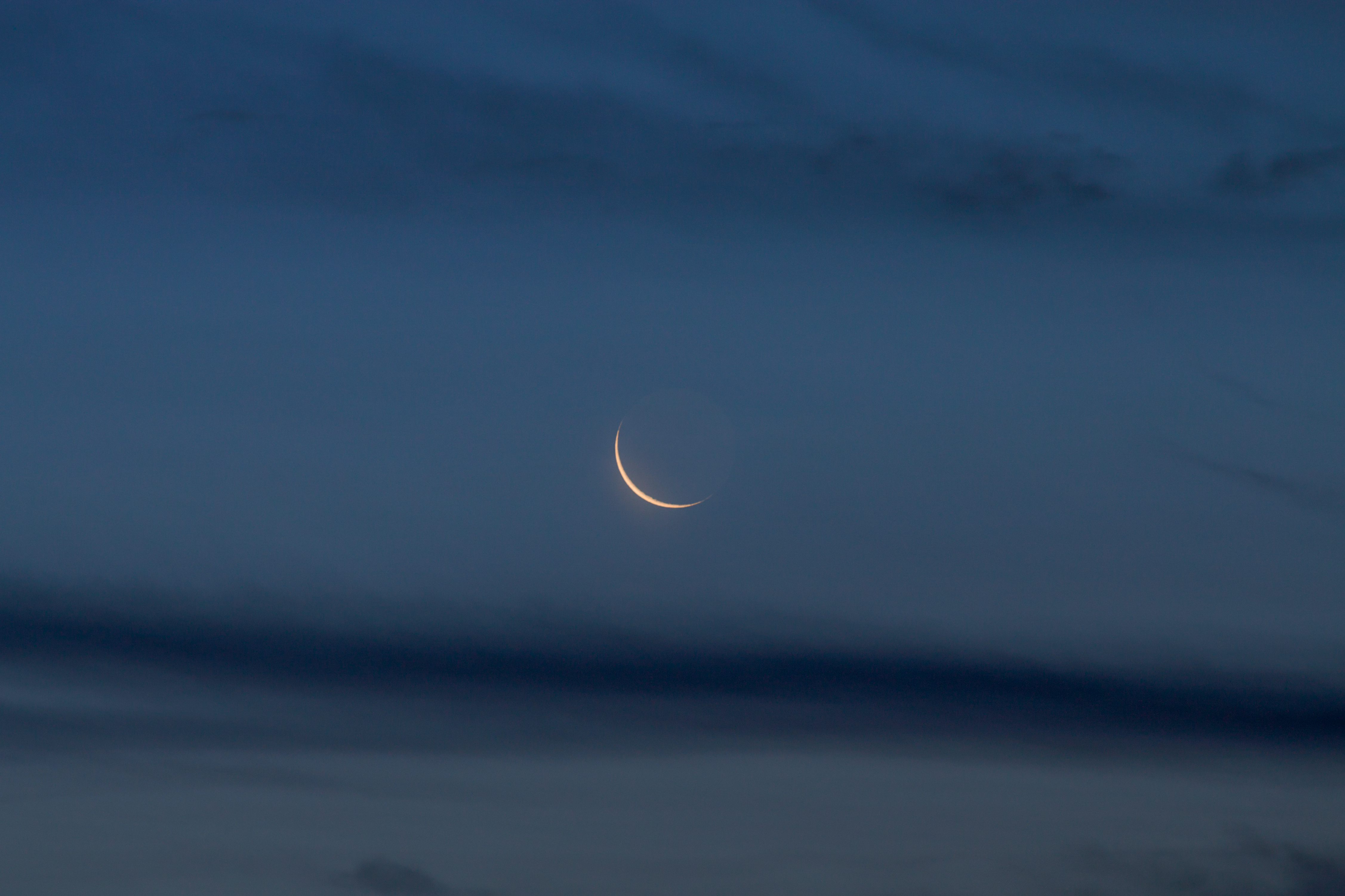 Am Morgen des 20. August 2017 war mir ein letzter Blick auf die abnehmende Mondsichel, 39h vor Neumond und der totalen Sonnenfinsternis, von Freital, Sachsen, aus möglich. Dünne Schleierwolken waren recht dekorativ, auch wenn man sie in der astronomischen Beobachtung eigentlich nicht wünscht.