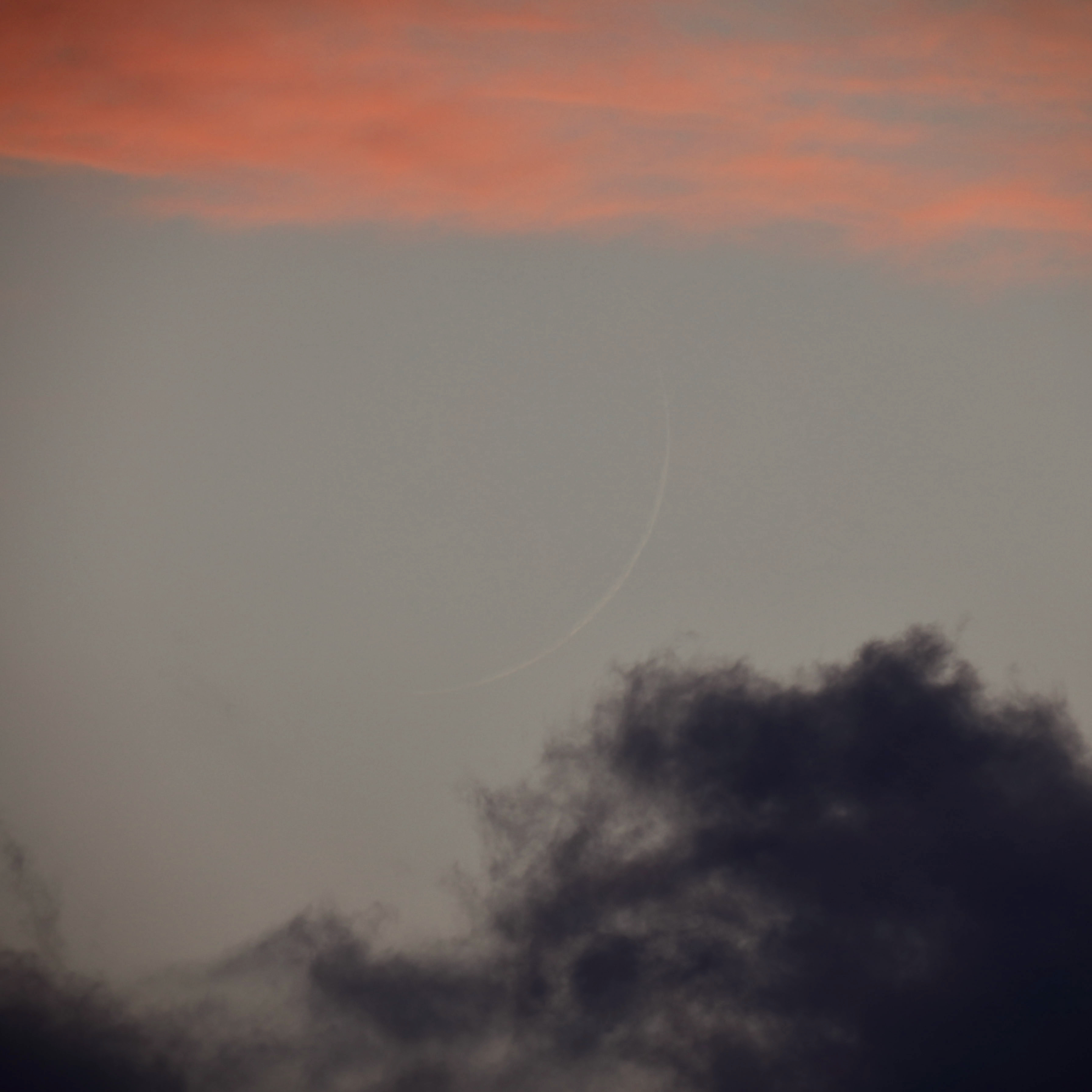 Nachdem es am 8. August 2021 wetterbedingt nicht möglich war, die zu 0,2 Prozent beleuchtete Mondsichel zu jagen, habe ich es am 9. nochmal versucht. Sie war nun zwar schon 29 h alt und zu 1,2 Prozent beleuchtet, dafür haben die Wolken das Bild aufgehübscht.