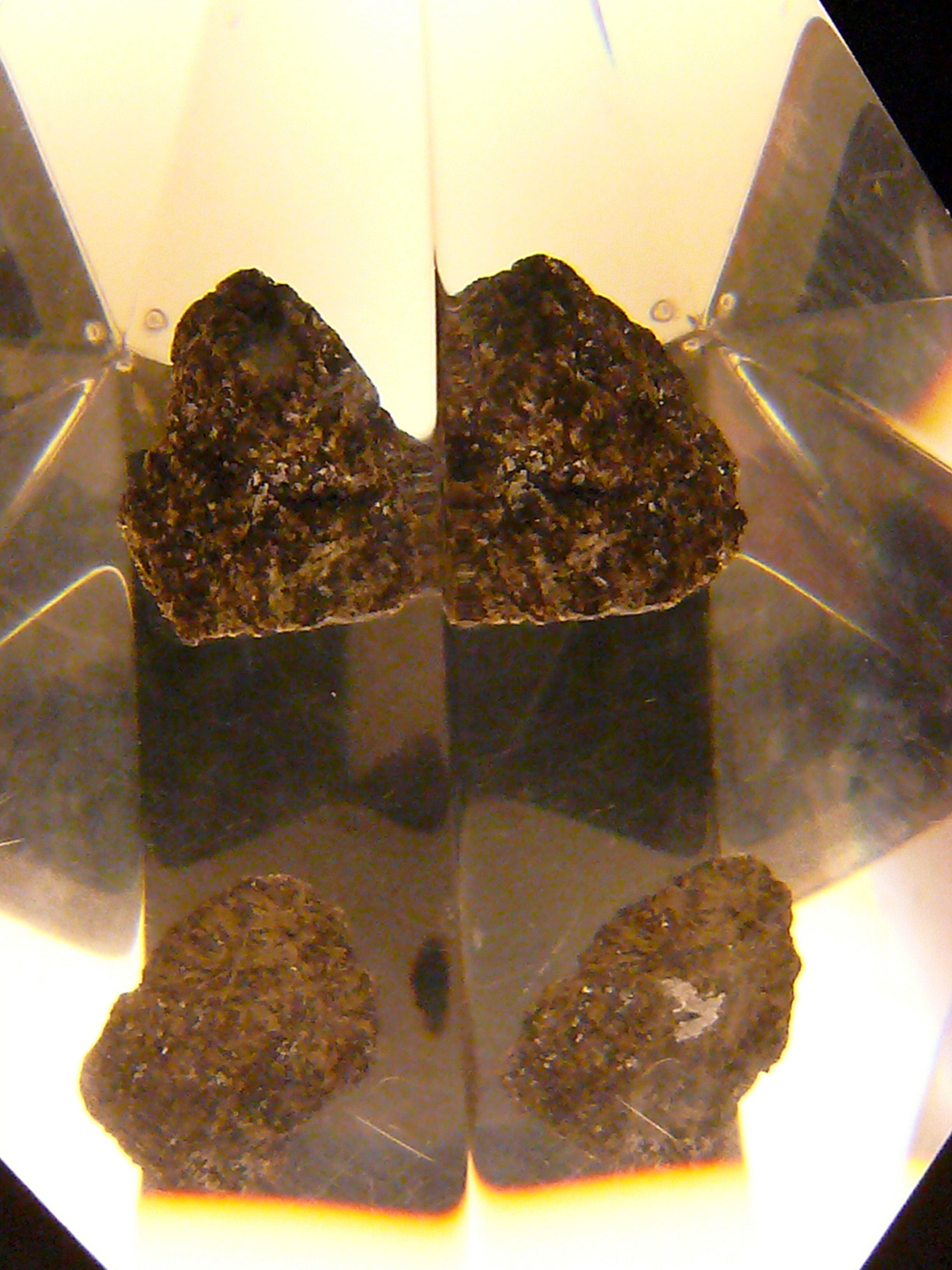 Die vierfache Spiegelung entsteht allein durch die Brechungen innerhalb der kleinen transparenten Pyramide, in die das Fragment vom "Great Scott" eingegossen ist; keines der Bilder ist nachbearbeitet.