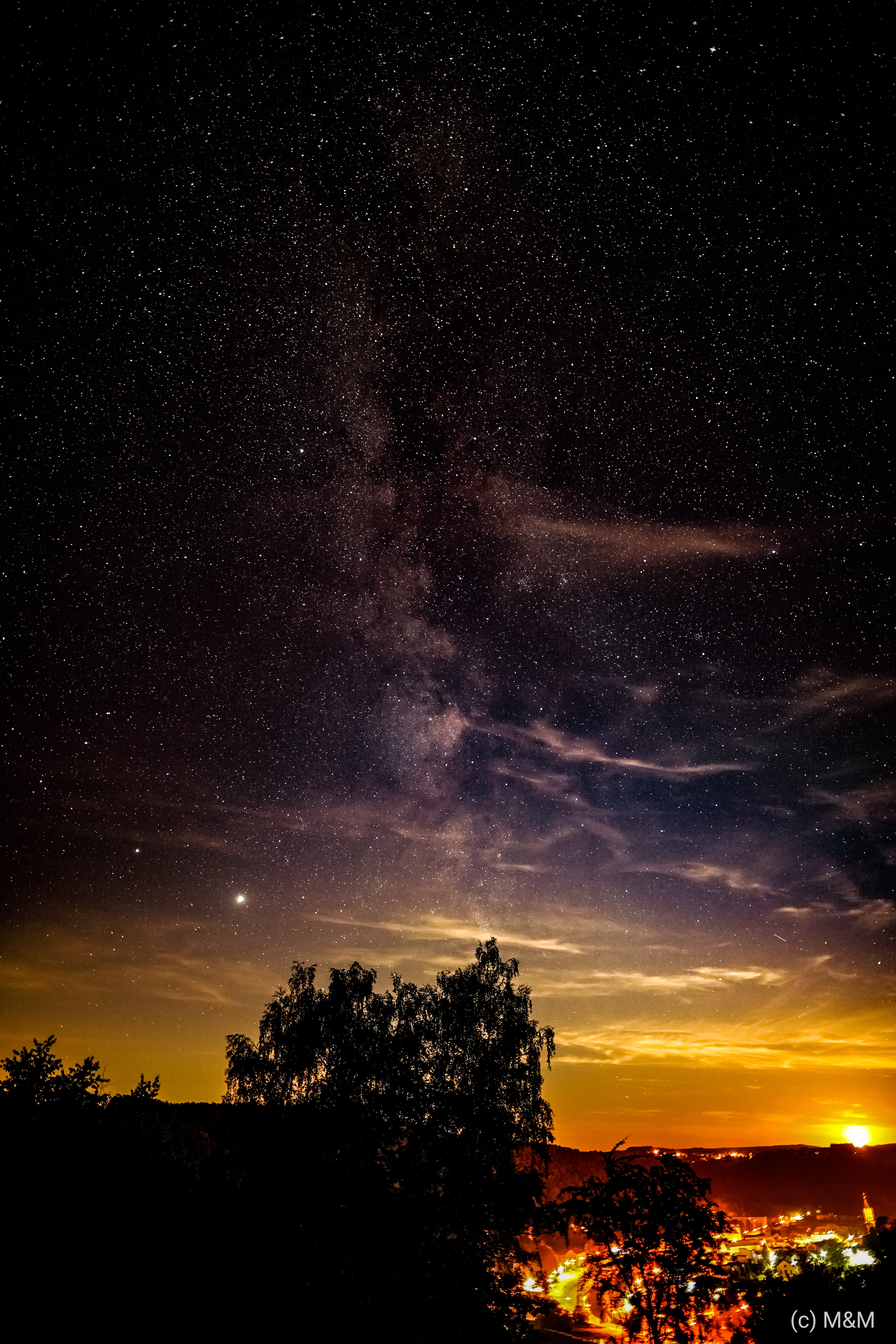 Beim Versuch, die Straßenlichter der Stadt Elsterberg aufzunehmen, kam der Monduntergang dazwischen und verfärbte die Milchstraße in ein schönes Violett.