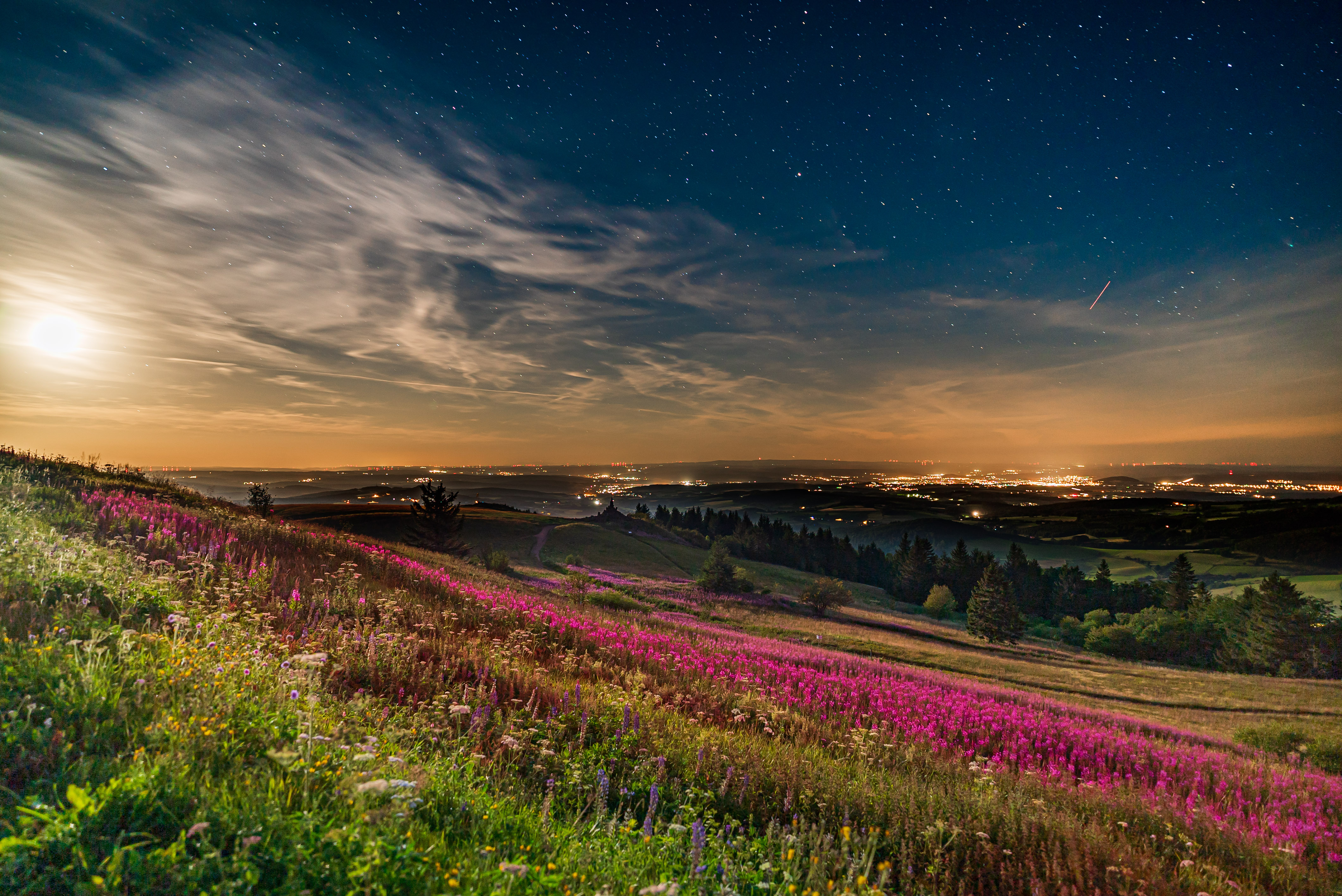 Monduntergang mit Blumenmeer auf der Wasserkuppe von letzter Nacht. Wenn man genau schaut, leuchtet am rechten Bildrand den Komet Neowise grünlich.