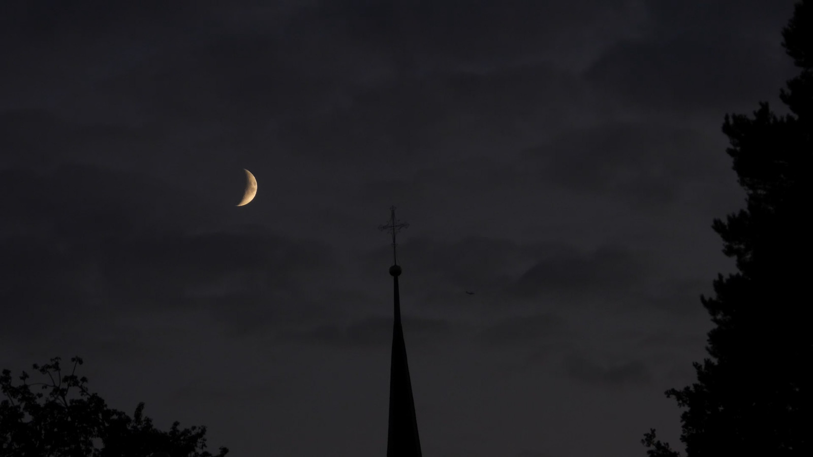 Am 11. August 2021 ging der Mond kurz nach dem Sonnenuntergang unter und kreuzte noch eine Kirchturmspitze bei Würzburg. Ein Flugzeug ist auch noch rechts neben dem Kirchturm. Film unter: https://www.youtube.com/watch?v=STfSd3I4FCE