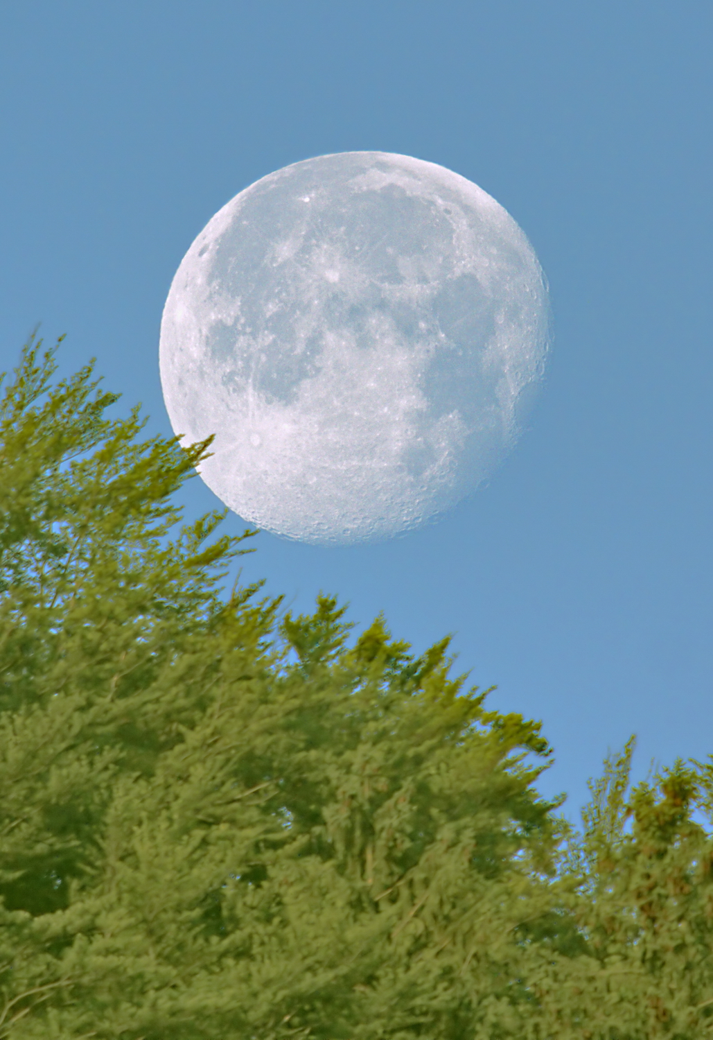 Glücklicherweise hatte ich meinen Fotoapparat samt Teleobjektiv und Stativ fixfertig griffbereit, und so konnte ich vom Fensterbrett aus noch einige Aufnahmen gewinnen, bevor der Erdtrabant an diesem Morgen "schlafen" ging!
