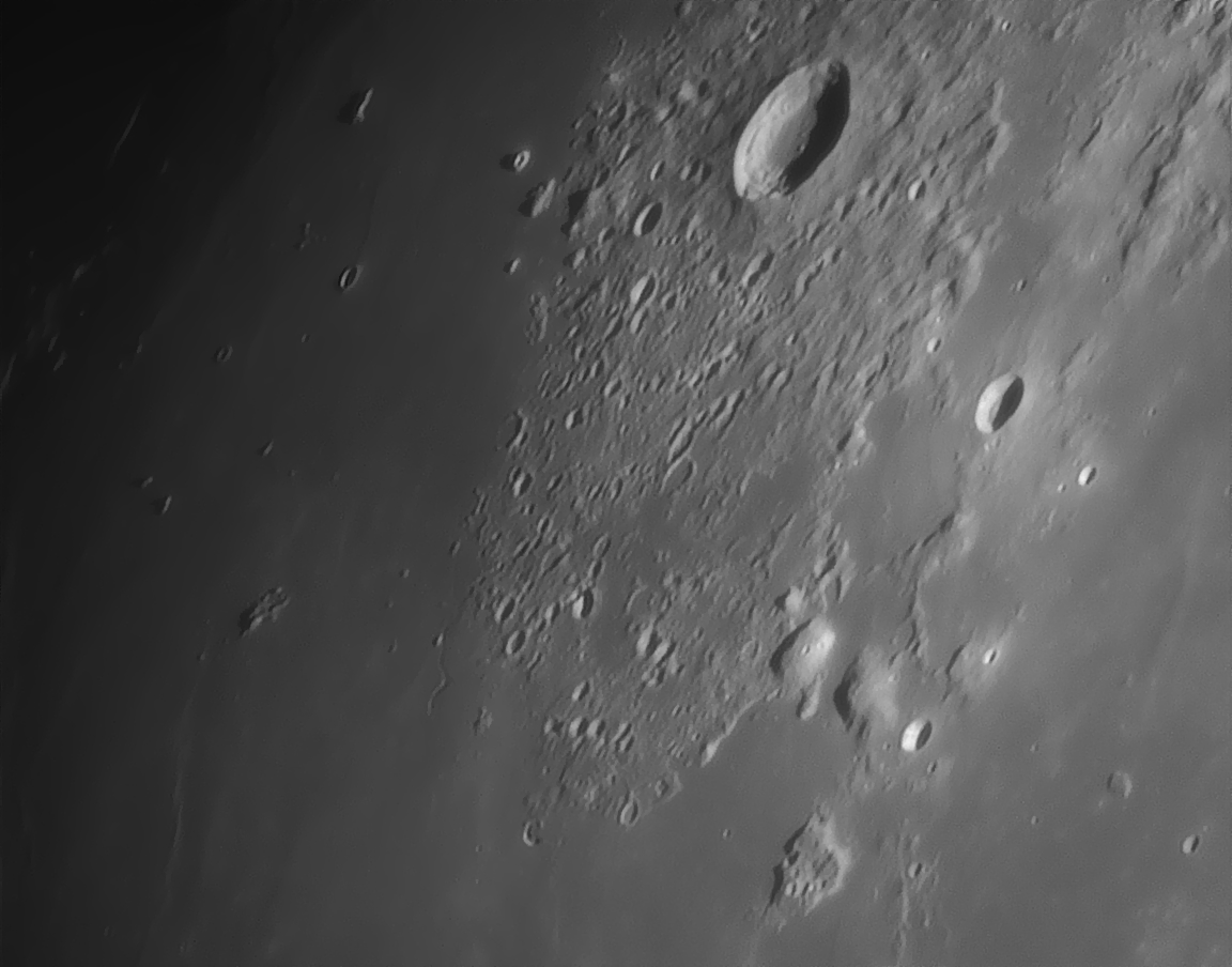 Schildvulkane als Zeugen früherer vulkanischer Tätigkeit gehören zu den seltensten Erscheinungen auf der Mondoberfläche. Im rechten unteren Bildviertel finden sich die Dome Montes Gruithuisen Gamma und Delta.
