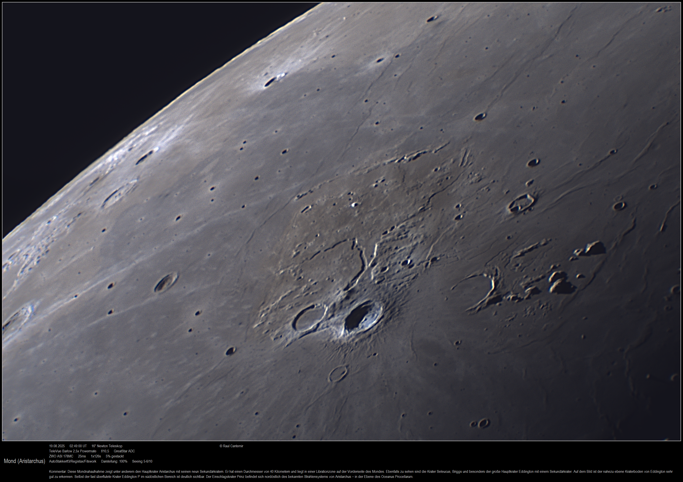 Diese Mondnahaufnahme zeigt unter anderem den Hauptkrater Aristarchus mit seinen neun Sekundärkratern. Er hat einen Durchmesser von 40 Kilometern und liegt in einer Librationzone auf der Vorderseite des Mondes. Ebenfalls zu sehen sind die Krater Seleucus, Briggs und besonders der große Hauptkrater Eddington mit einem Sekundärkrater. Auf dem Bild ist der nahezu ebene Kraterboden von Eddington sehr gut zu erkennen. Selbst der fast überflutete Krater Eddington P im südöstlichen Bereich ist deutlich sichtbar. Der Einschlagskrater Prinz befindet sich nordöstlich des bekannten Strahlensystems von Aristarchus – in der Ebene des Oceanus Procellarum.