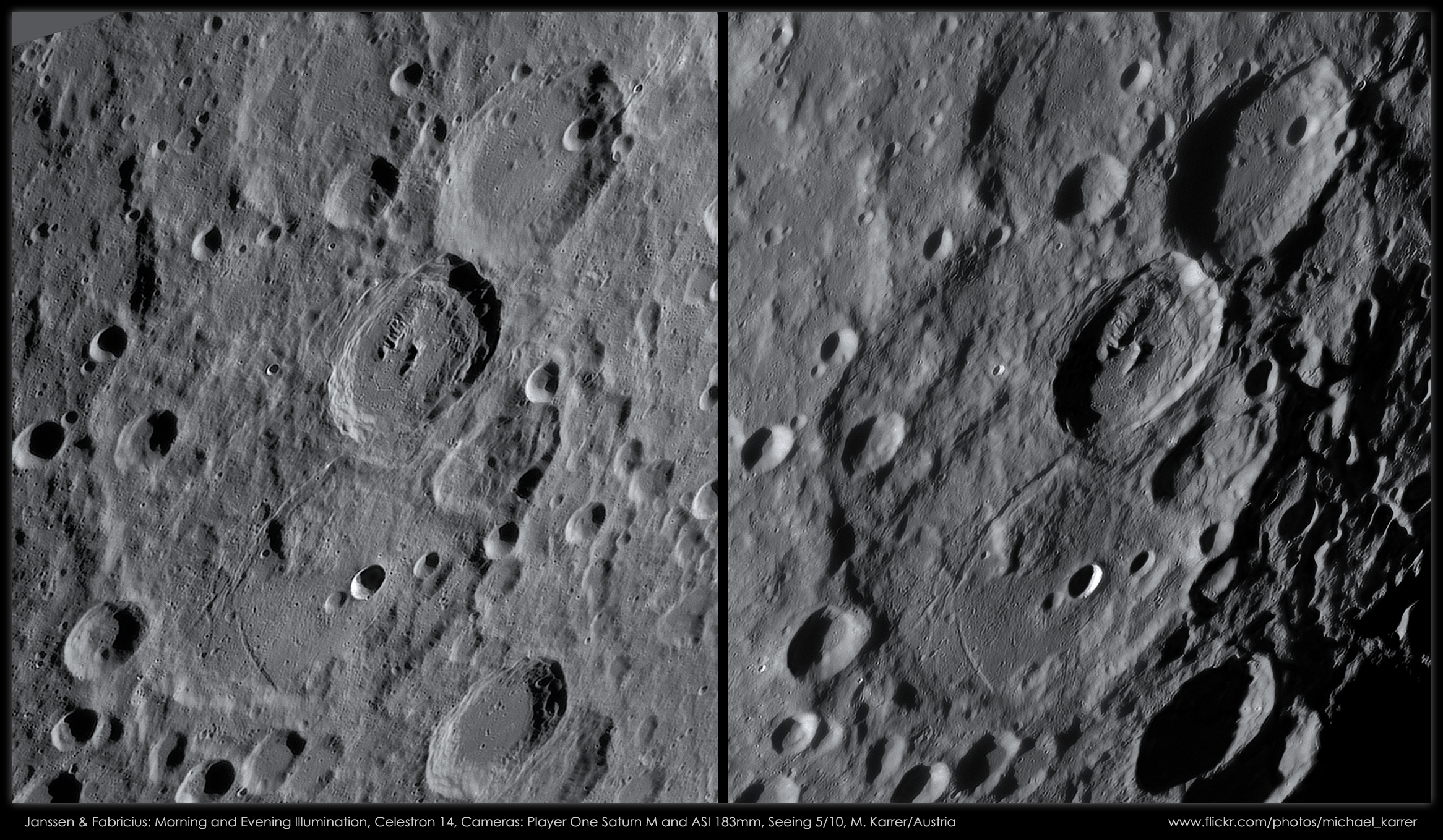 Der statische Mond kann durchaus abwechslungsreich sein, besonders wenn man Morgen- und Abendbeleuchtung gegenüber stellt. In meinem Archiv fand ich eine Abendaufnahme (also aufgenommen am Morgenhimmel) vom November 2022. Die Morgenbeleuchtung ist aufgenommen am 5. März. Das Seeing war gut.