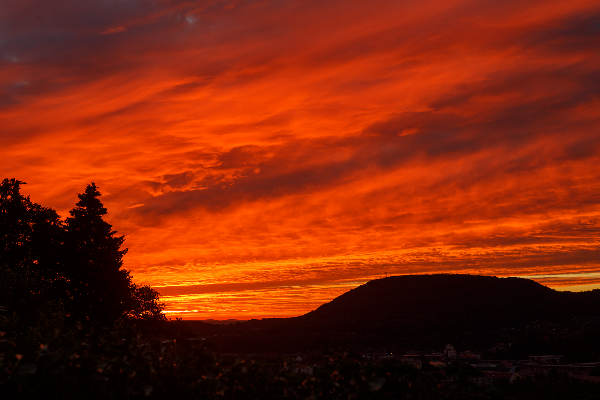 Fantastisches Morgenrot kurz vor Sonnenaufgang am 13. Juli 2022 über Freital. Das Landschaft war in ein herrliches rötlich-orangenes Licht getaucht. Allerdings traf traf die Bauernregel »Morgenrot-Schlechtwetterbot« diesmal nicht zu.