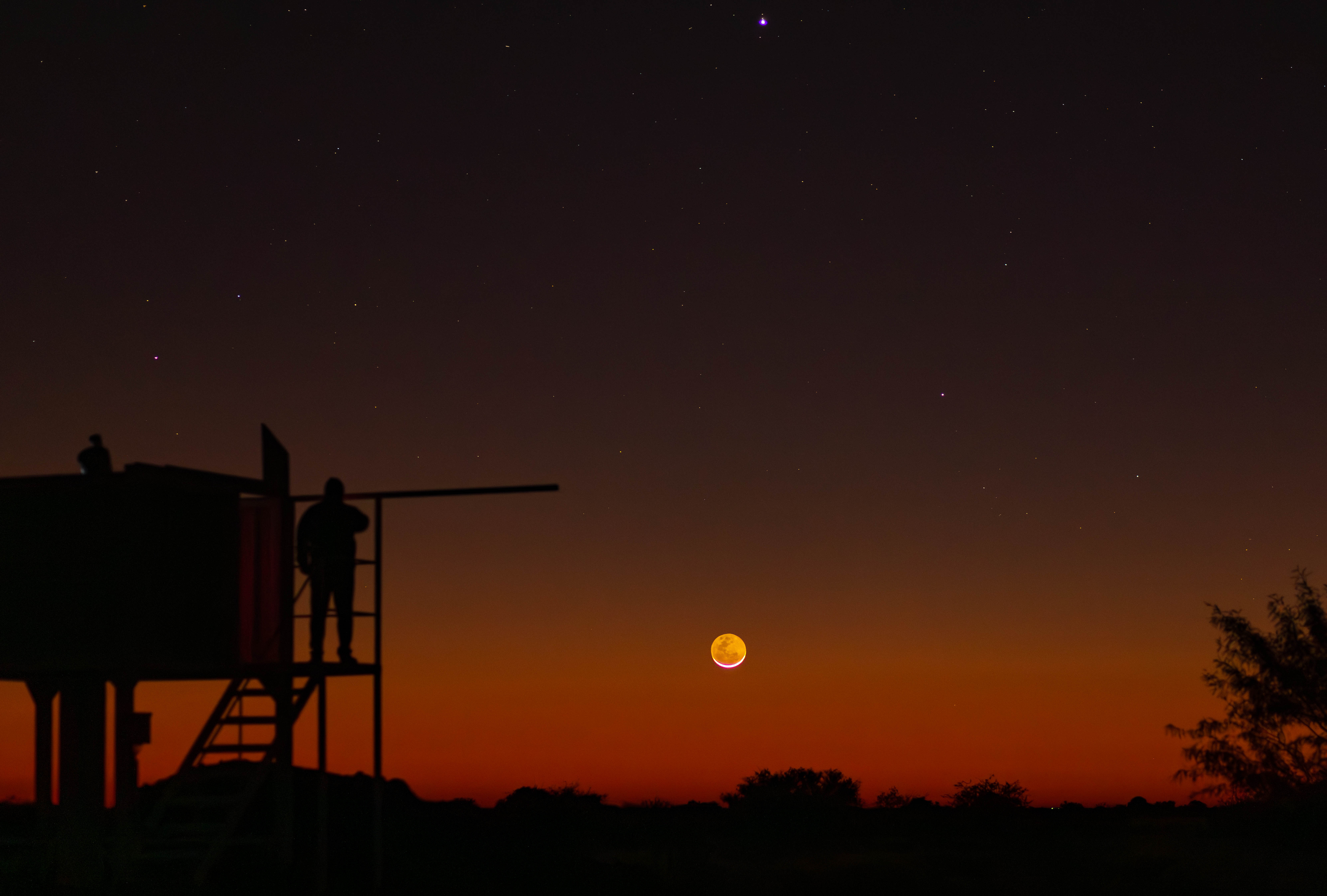 Nach einer ersten langen Nacht auf der Astrofarm Kiripotib in Namibia ergab sich kurz vor Sonnenaufgang für wenige Minuten ein herrliches Farbenspektakel mit Mond, Jupiter und Merkur.