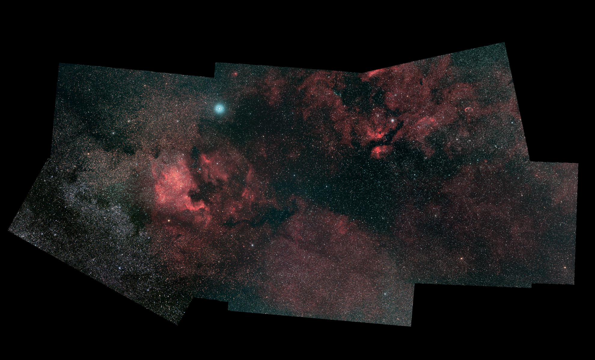 Dunkelwolken, hellen Sternansammlungen und vor allem leuchtenden H-alpha-Wolken zusammengestzt. Dabei dominiert auf dem linken Teil des Bildes der Nordamerikanebel NGC 7000 mit seinem etwas dunkleren Begleiter IC 5070 dem Pelikannebel. Der helle blaue Stern ist Deneb, ein Stern erster Größe. Die nächste helle H-alpha-Gruppe bildet der Schmetterlingsnebel beim Stern Gamma Cygni. rechts oben auf 3 Uhr.