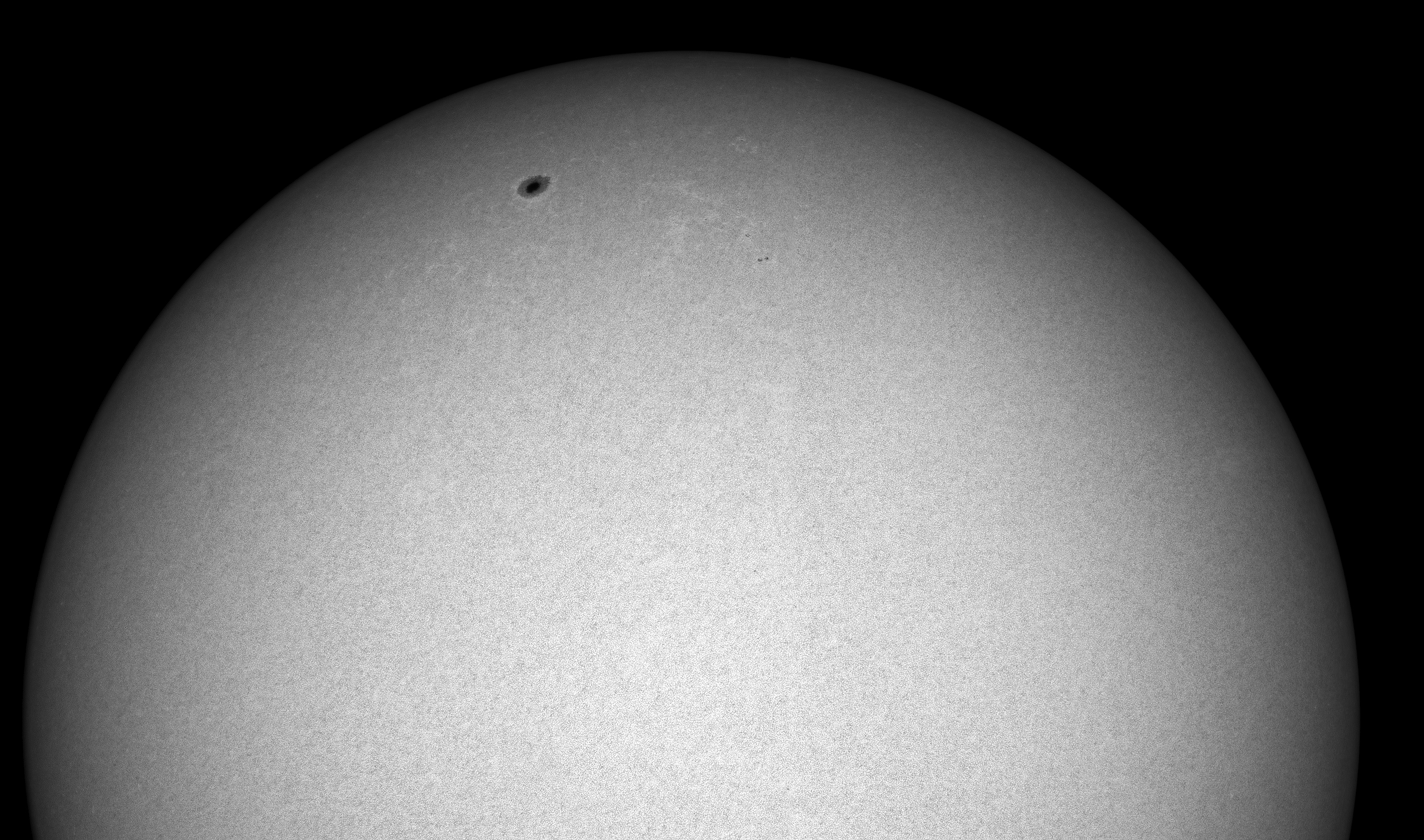 Die Sonnenaktivität ist auf dem absteigenden Ast und dementsprechend schwierig ist es, ein Mosaik der Weißlichtsonne anzufertigen. Schließlich hat man auf der "nackten" Sonnenoberfläche kaum Anhaltspunkte zum Überlagern der Einzelbilder … Hier ein mehr oder weniger geglückter Versuch. In voller Auflösung sieht man die Granulation schön. Die andere Sonnenhälfte litt leider an schlechtem Seeing …