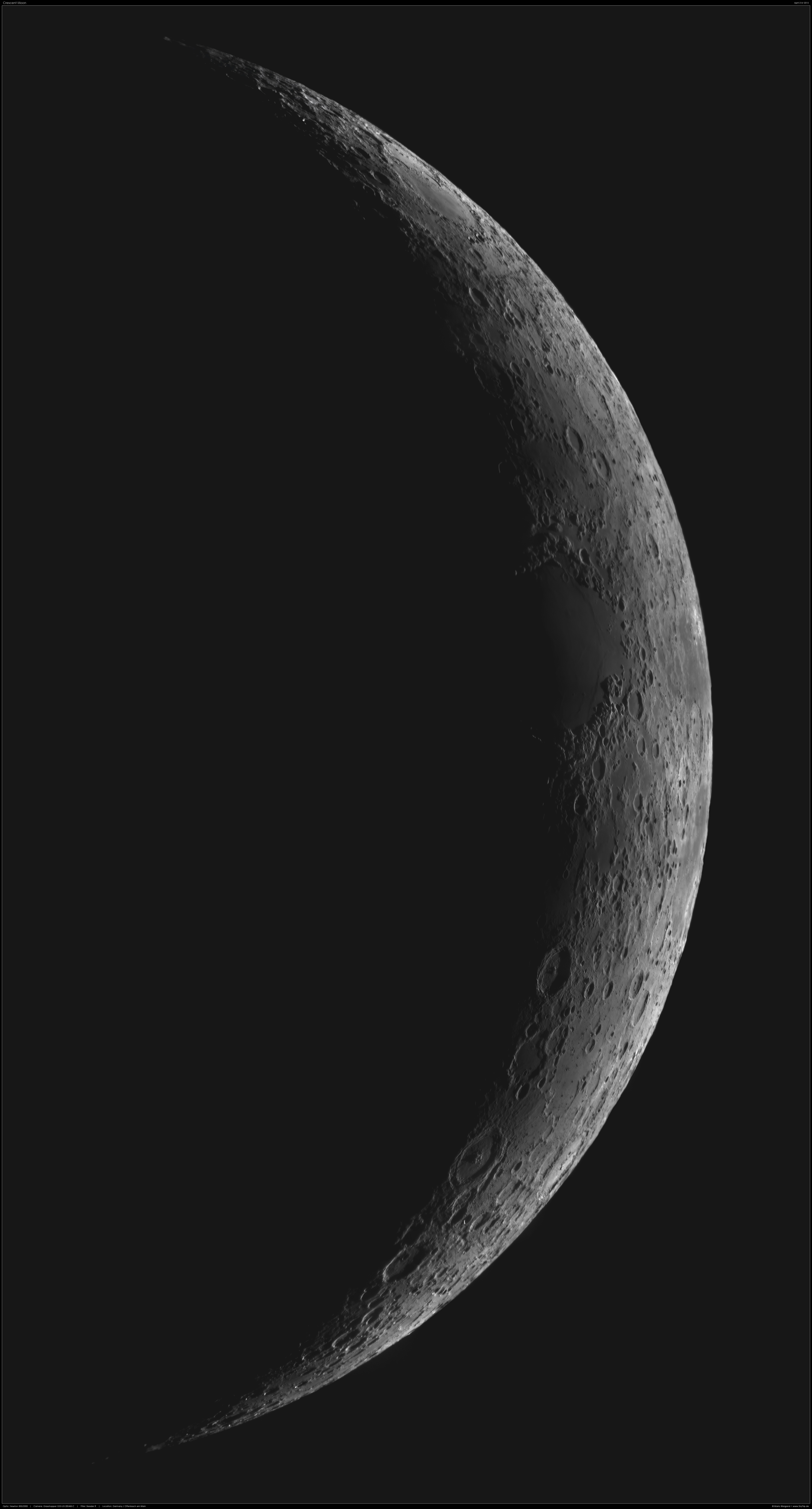 Der Terminator entlarvt bei einem Mondalter von rund drei Tagen fünf markante Strukturen, die fast genau auf dem gleichen Längengrad liegen. Nördlich des Mondäquators ist Mare Crisium zu sehen. Südlich davon sind vier große Krater – wie auf einer Perlenschnur aufgereiht – zu sehen. Von Norden nach Süden: Langrenus, Vendelinus, Petavius und Furnerius.