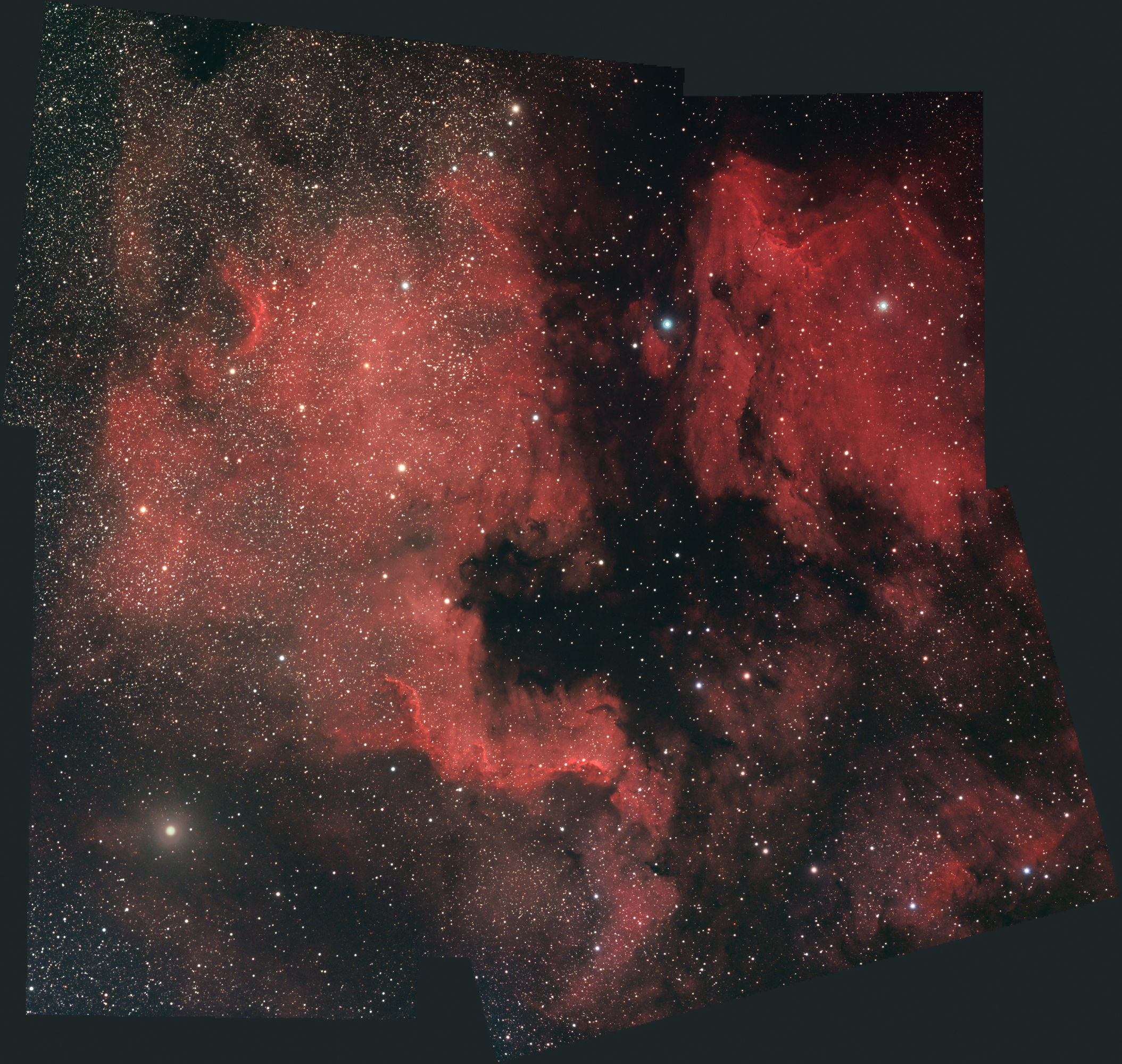 Die Nordamerikanebelregion hatte ich schon öfters bei 200 mm Brennweite mit dem Teleobjektiv aufgenommen, aber eine richtig gute Bildauflösung ergab sich erst bei der Erstellung eines Mosaiks.